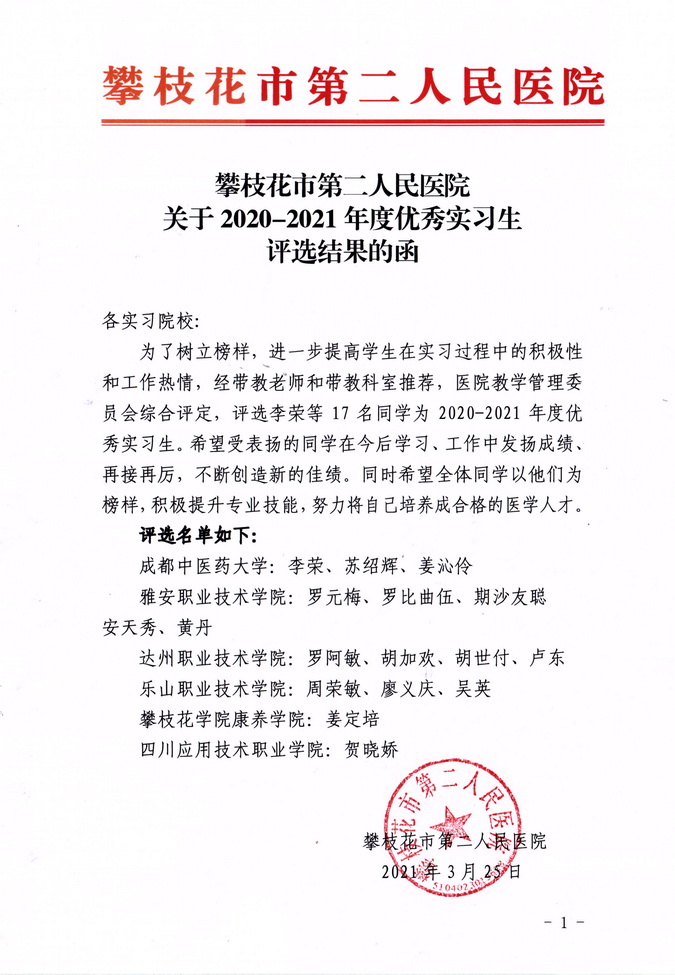 攀枝花市第二人民医院发来信函,将周荣敏、廖义庆、吴英三名同学评为“2020-2021年度优秀实习生”。