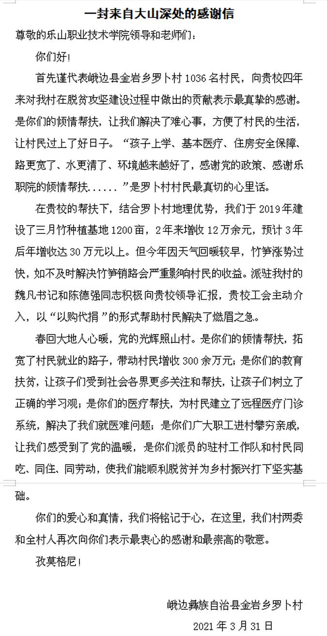 为感谢学院的帮助,罗卜村还专门给学院送来了感谢信: