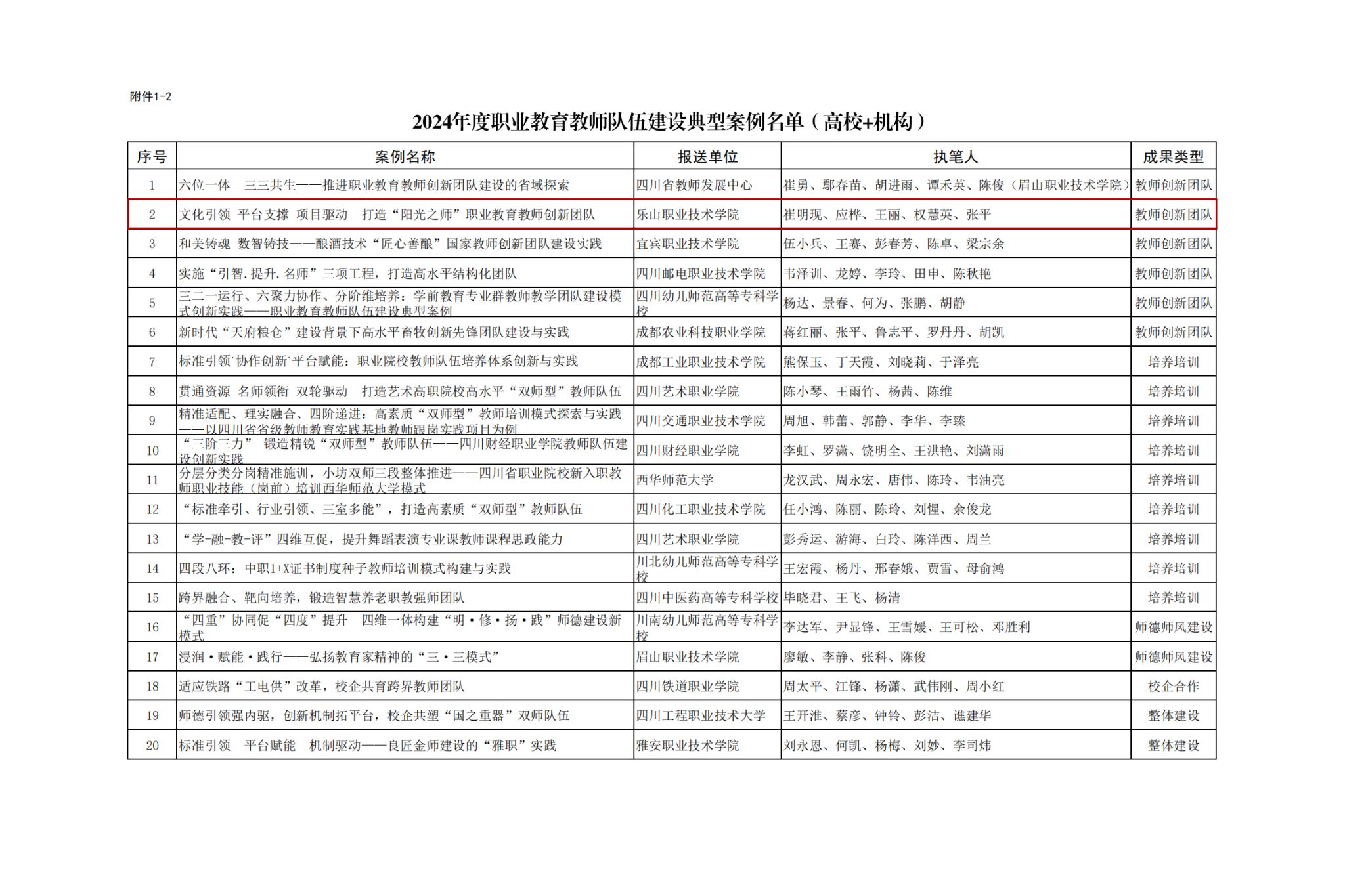为进一步加强四川省职业教育教师队伍建设,凝练和推广可复制、可借鉴的典型案例,展示我省职业教育教师队伍建设的高质量发展成果,2月13日,四川省教育厅发布了《2024年度职业教育教师队伍建设典型案例集》,共评选出30个典型案例。beat365《文化引领 平台支撑 项目驱动,打造“阳光之师”职业教育教师创新团队》成功入选。