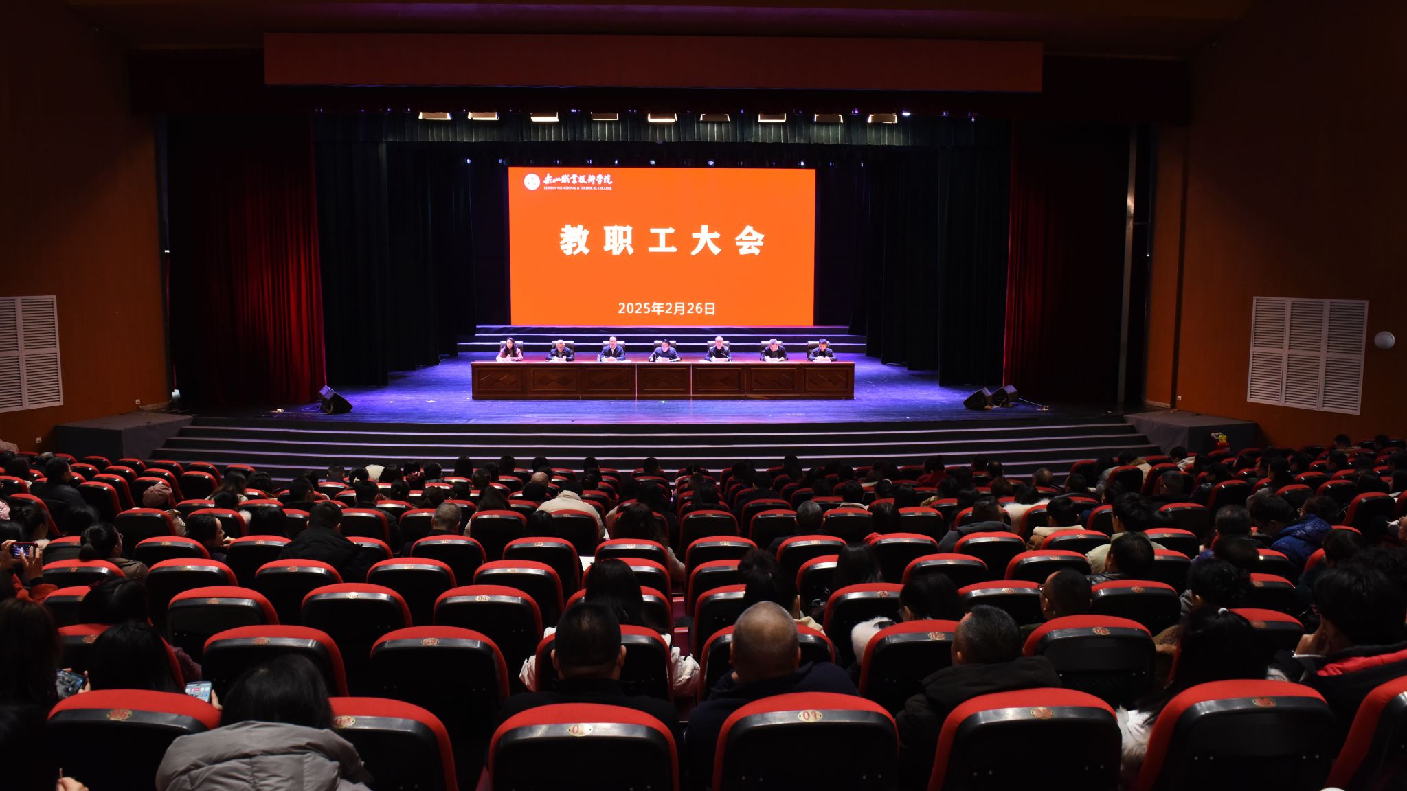 2月26日上午,学校2025年春季学期教职工大会在礼堂召开。全体校领导及全校教职工参加会议。学校党委书记成定彬在会上讲话,校长刘忠总结2024年学校工作并安排部署2025年相关工作。会议由学校党委副书记、工会主席张佳主持。