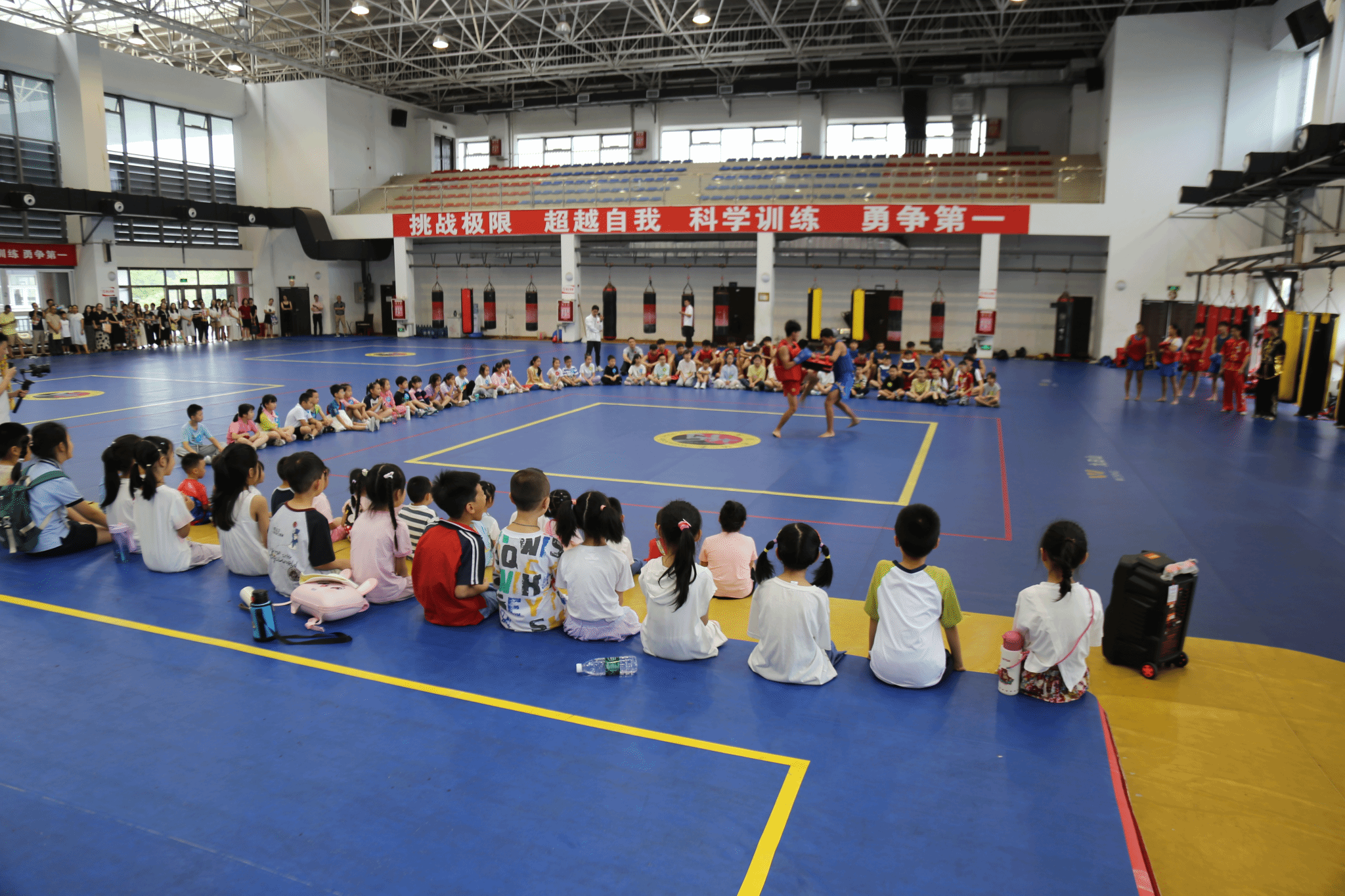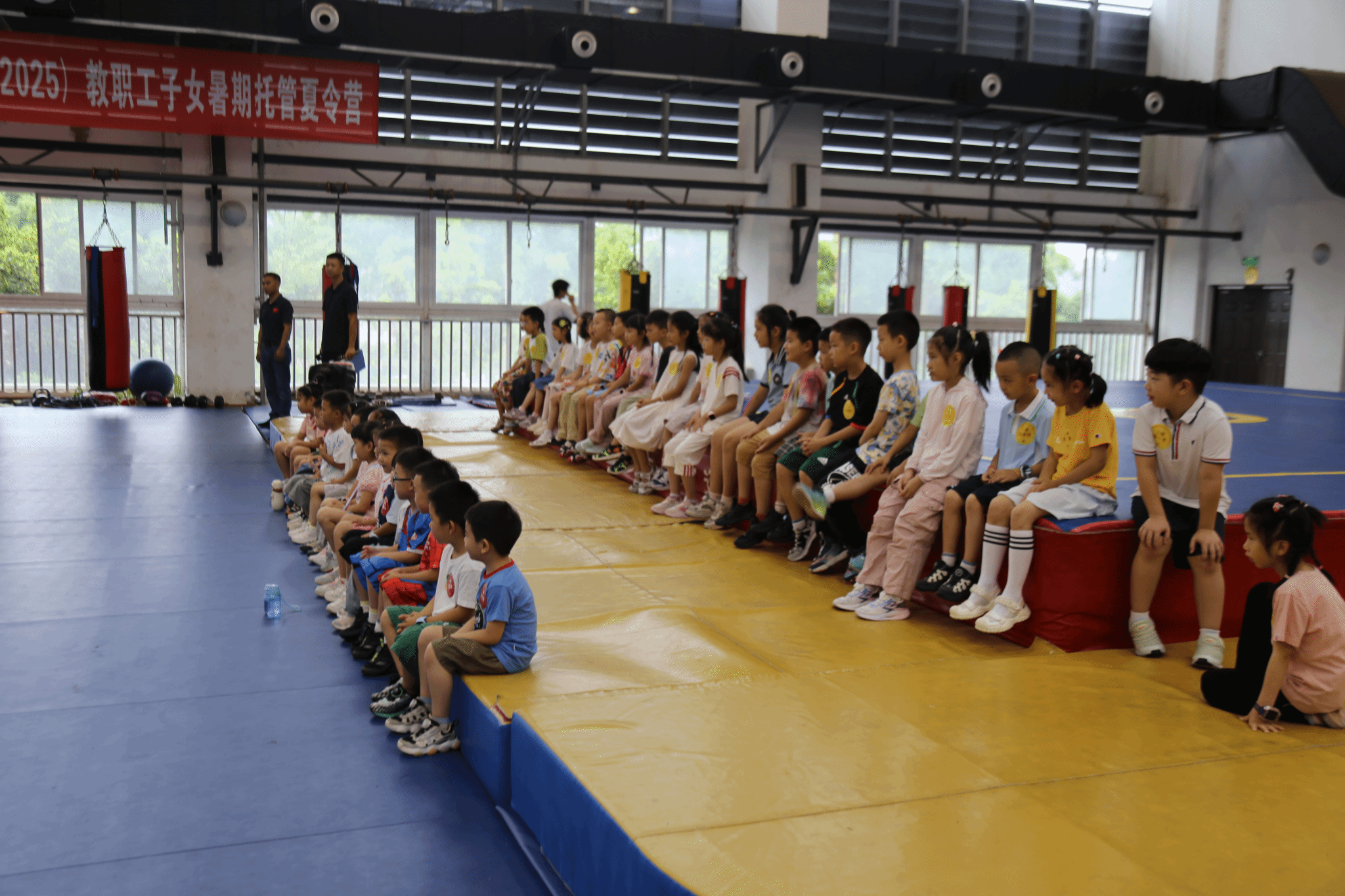 6月30日上午,在beat365亚洲版官网体育馆二楼青江武术散打训练基地,在嘹亮的国歌声和精彩的武术展演活动中开启了beat365第三届教职工子女暑期爱心托管夏令营。100余名教职工子女及其家长参加了开营仪式。