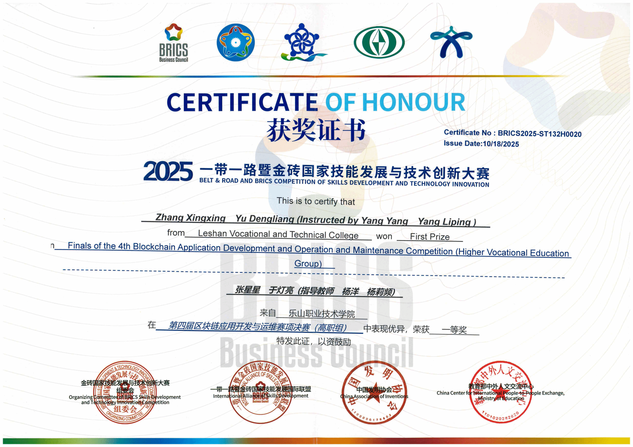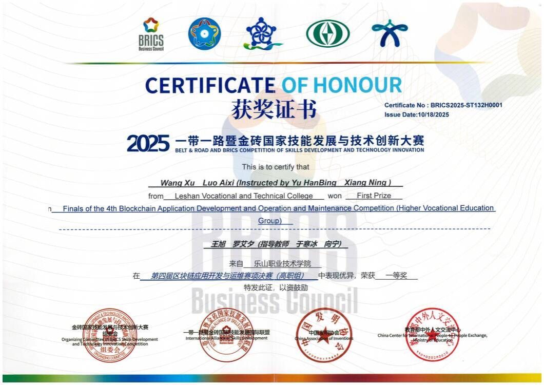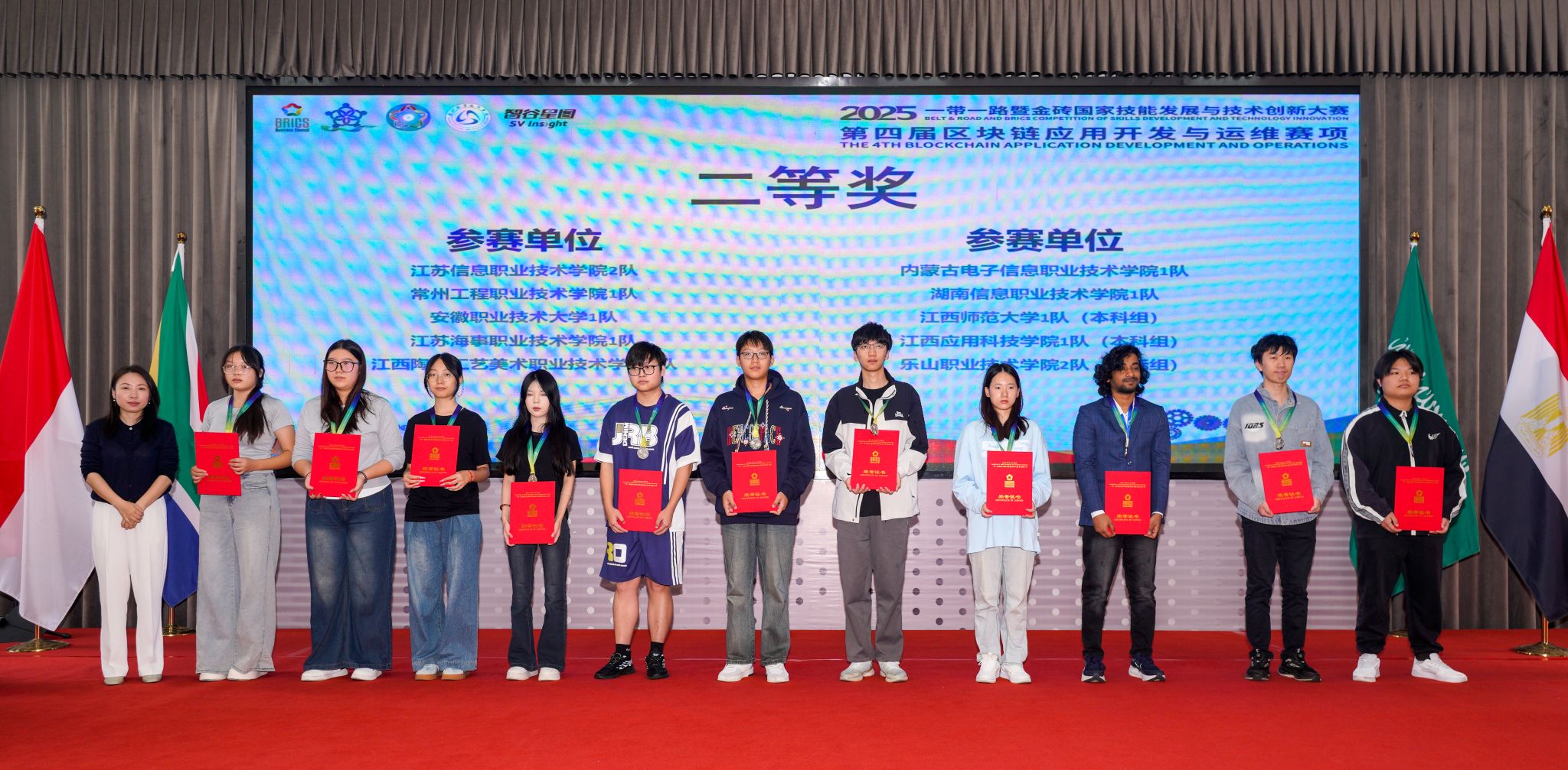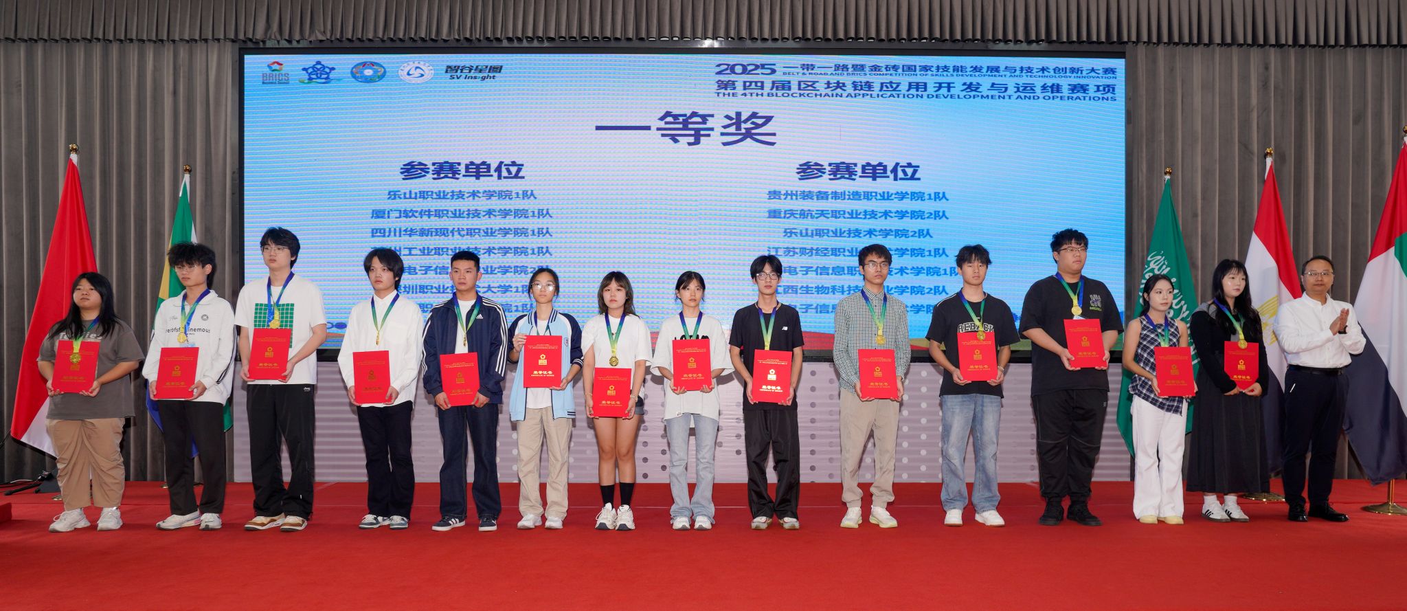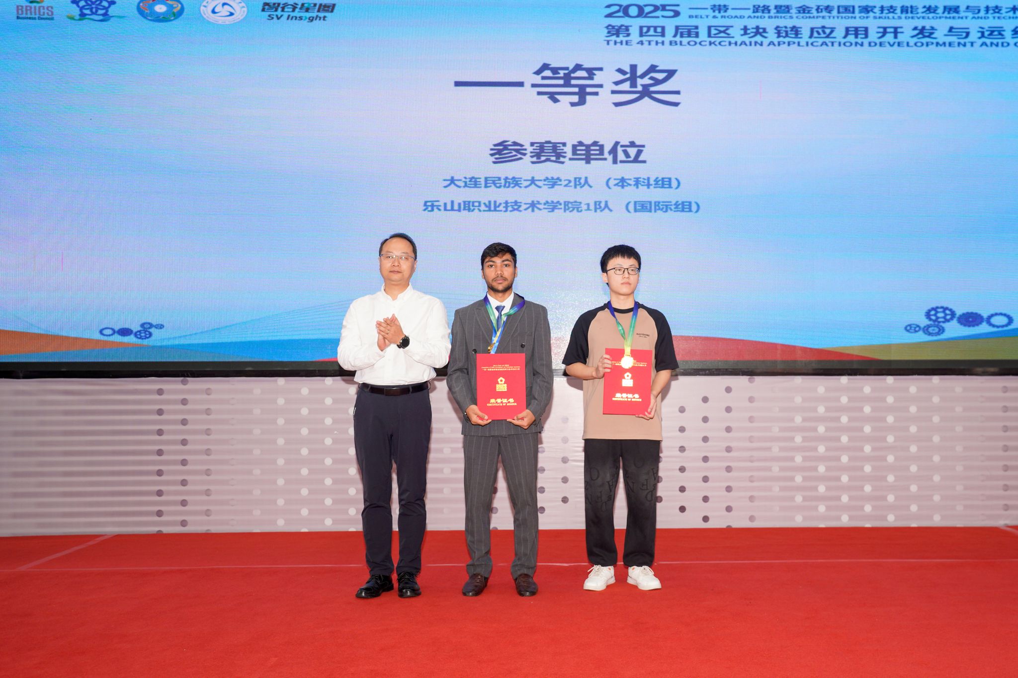 10月17日,2025“一带一路”暨金砖国家技能发展与技术创新大赛之第四届区块链应用开发与运维赛项在beat365举行,人工智能学院组织四支队伍参赛。经过紧张激烈的比赛,beat365学生共获得高职组、国际组三个一等奖,同时获得国际组二等奖。本届大赛由金砖国家工商理事会中方理事会、“一带一路”暨金砖国家技能发展国际联盟、“一带一路”暨金砖国家技能发展与技术创新培训中心、中国发明协会、教育部中外人文交流中心主办。beat365作为联合承办单位之一承办了本次比赛。