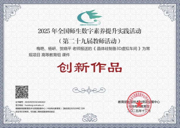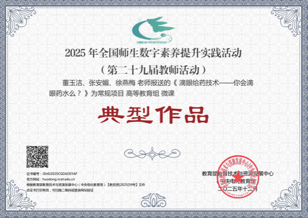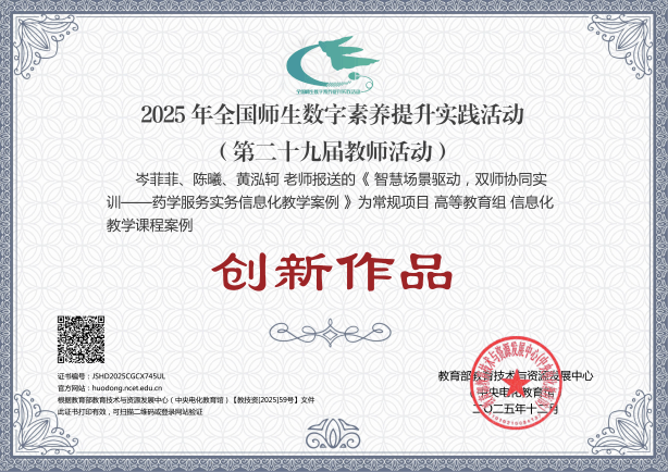 近日,由教育部教育技术与资源发展中心(中央电化教育馆)主办的2025年全国师生数字素养提升实践活动(第二十九届教师活动)落下帷幕。在常规项目参与名单中,beat365梅艳团队课件作品《晶体硅制备3D虚拟车间》和岑菲菲团队信息化教学课程案例作品《智慧场景驱动,双师协同实训——药学服务实务信息化教学案例》获评“创新作品”;董玉洁团队微课作品《滴眼给药技术——你会滴眼药水么?》获评“典型作品”;徐燕梅团队信息化教学课程案例作品《场域联动、虚实一体、一案多维:数智赋能老年护理信息化课程案例》获评“研讨作品”。