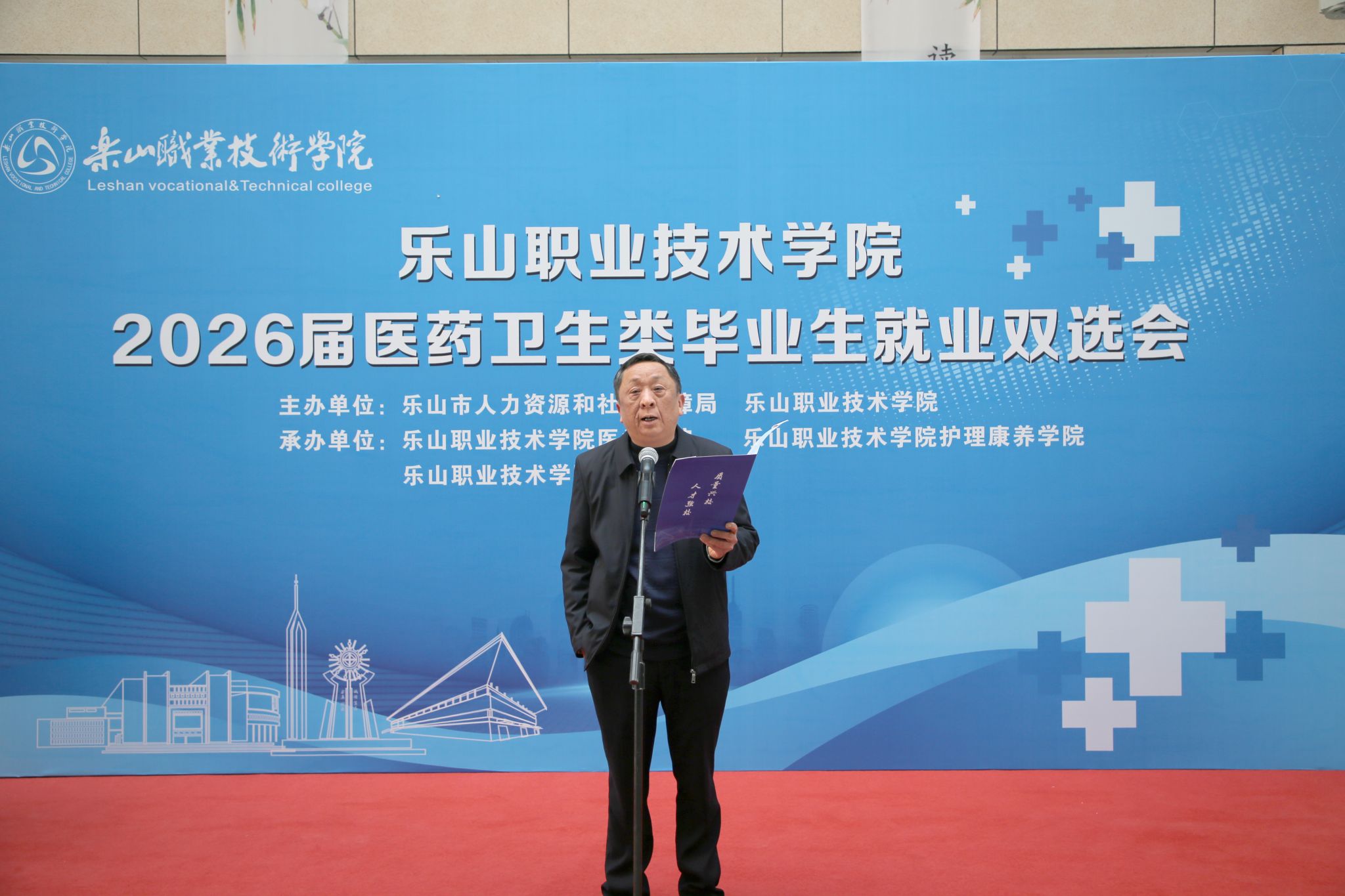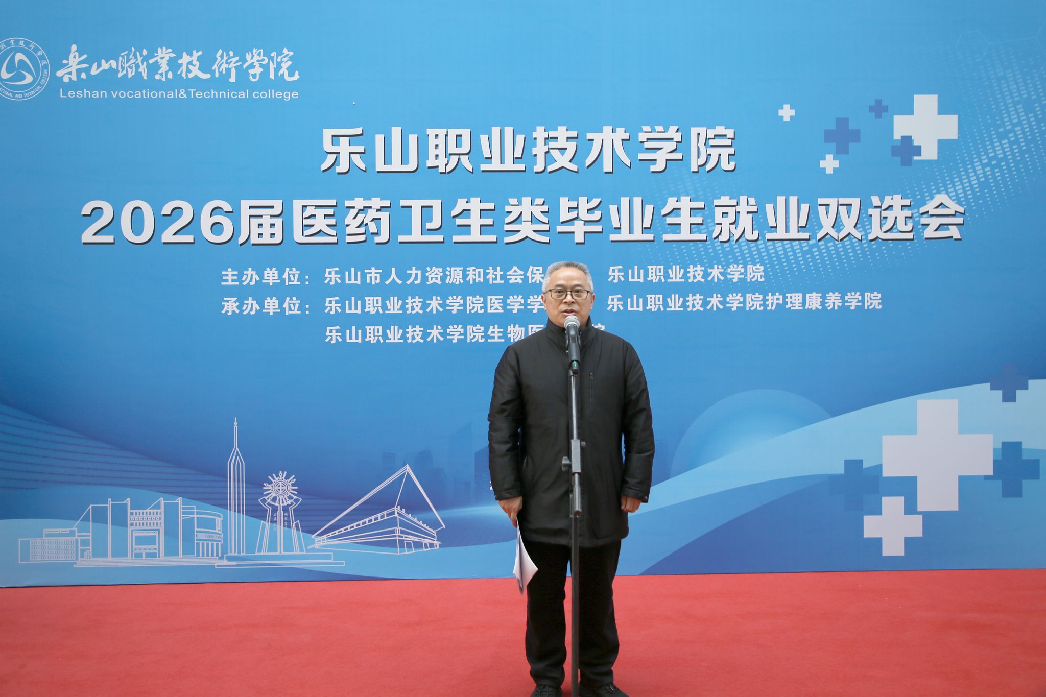 春启新程聚英才,校企携手促就业。1月9日,beat365亚洲版官网2026届医药卫生类毕业生就业双选会顺利举行。乐山市人力资源和社会保障局二级巡视员黄卫东出席活动并致辞,参会企业代表、学院师生代表共同参与。