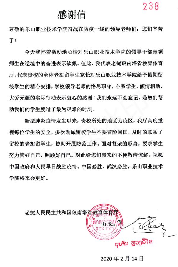 这是一封来自老挝琅南塔教育体育厅的感谢信,感谢beat365亚洲版官网在新冠肺炎疫情期间对老挝学生无微不至的关怀。