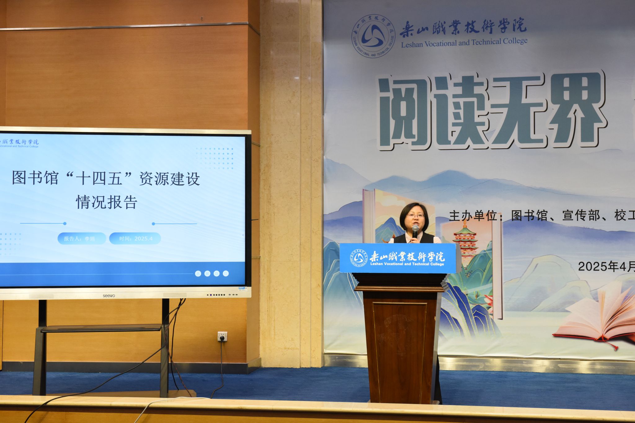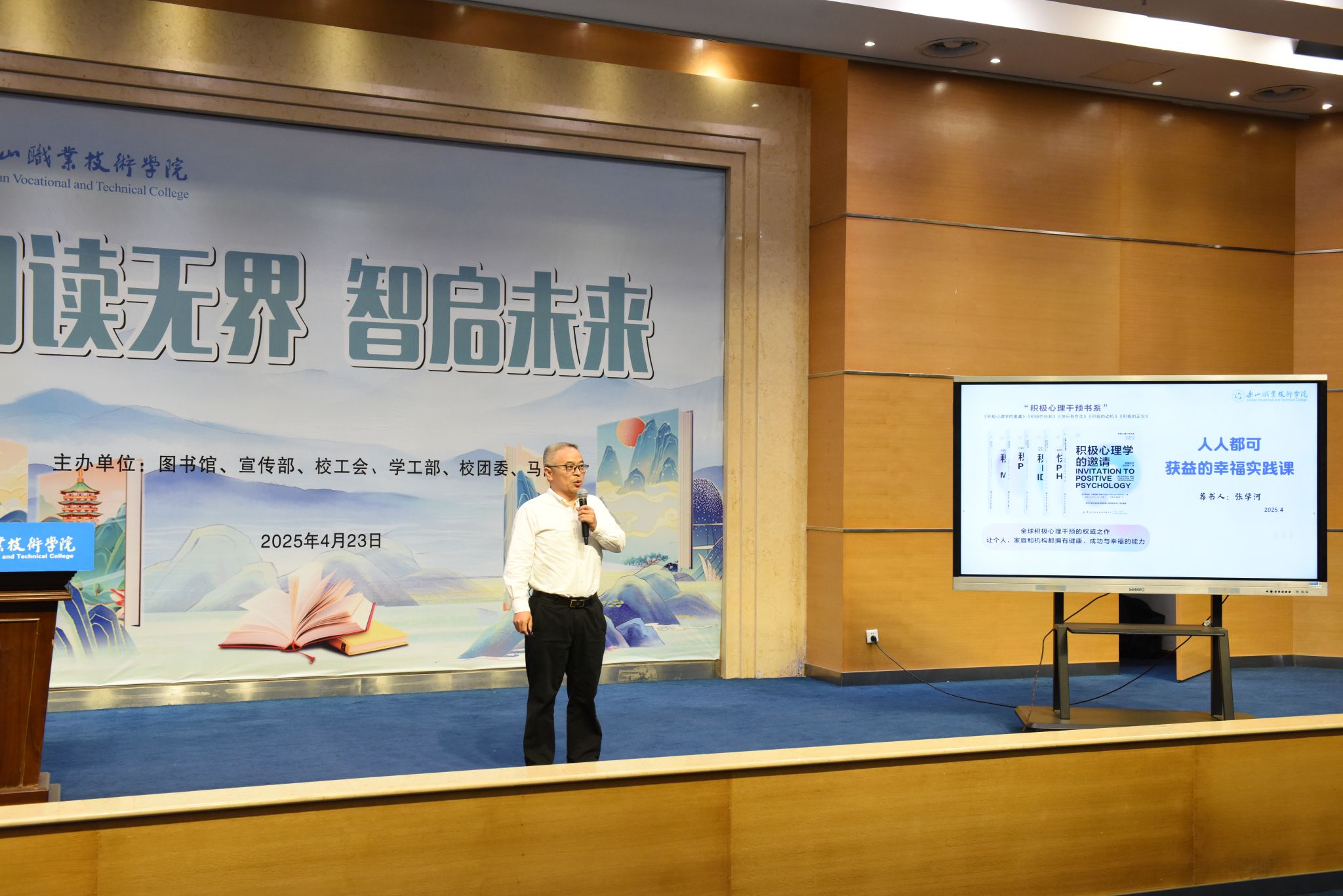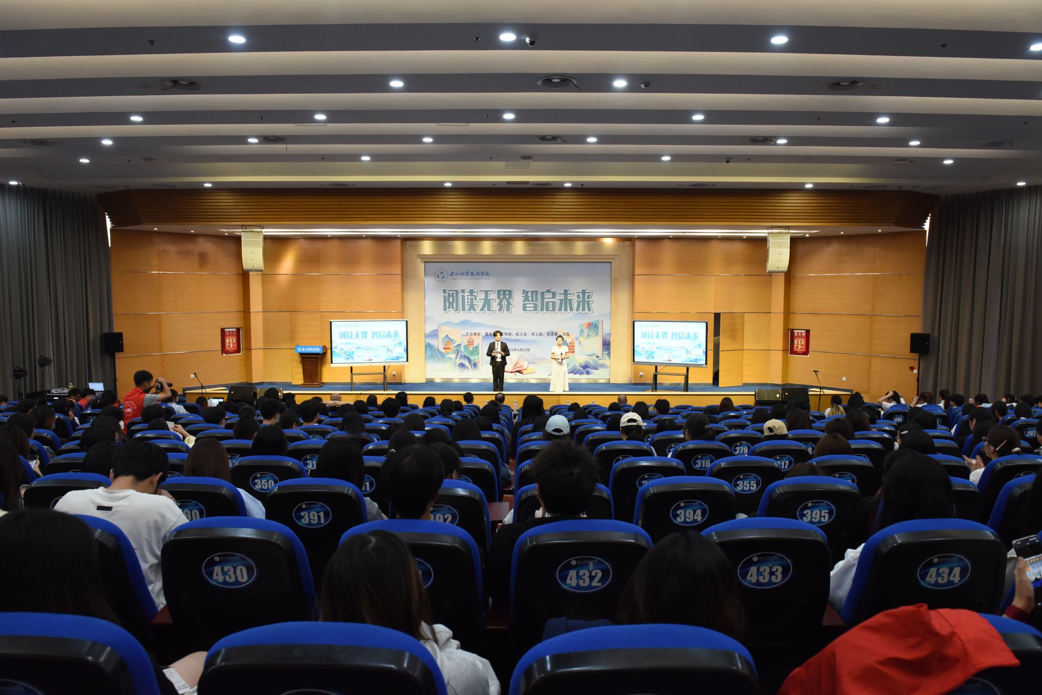 4月23日,beat365亚洲版官网“阅读无界 智启未来”世界读书日系列活动启动仪式在图书馆学术报告厅举行,拉开了全年阅读推广活动的序幕。校长刘忠,党委委员、副校长张学河,图书馆、宣传部、校工会、学生工作部、校团委、马克思主义学院相关负责人与近500名师生代表参加启动仪式。