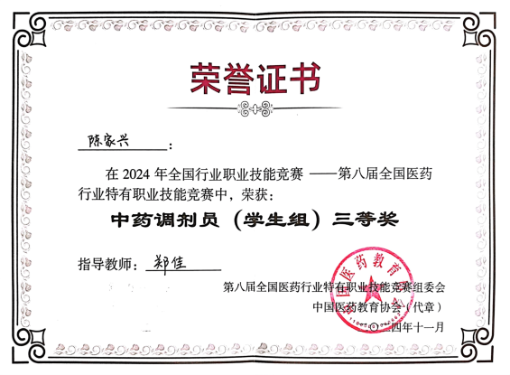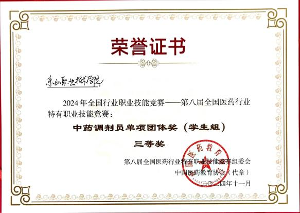 为深入贯彻国家关于弘扬劳模精神、劳动精神、工匠精神的号召,激励青年学子投身中医药事业,走技能成才、技能报国之路,由中国医药教育协会、中国就业培训技术指导中心主办的2024年全国行业职业技能竞赛——第八届全国医药行业特有职业技能《中药调剂员》赛项于2024年11月1日至11月3日在山西省太原市山西药科职业学院隆重举行。beat365亚洲版官网生物医药学院中药学专业的两位优秀学生陈家兴和朱灿,在副院长朱链链的率领下,以及郑佳与张俊两位老师的悉心指导下,代表学校出征,与全国61所高等院校的122名精英学子同台竞技。他们不仅充分展示了个人卓越的风采,也彰显了beat365亚洲版官网学子的精神风貌。经过一番激烈的角逐,他们最终荣获了中药调剂员单项团体奖(学生组)三等奖。其中,陈家兴同学凭借个人出色的表现,赢得了中药调剂员(学生组)个人三等奖的荣誉,而朱灿同学也荣获了优胜奖,为学校增添了光彩。