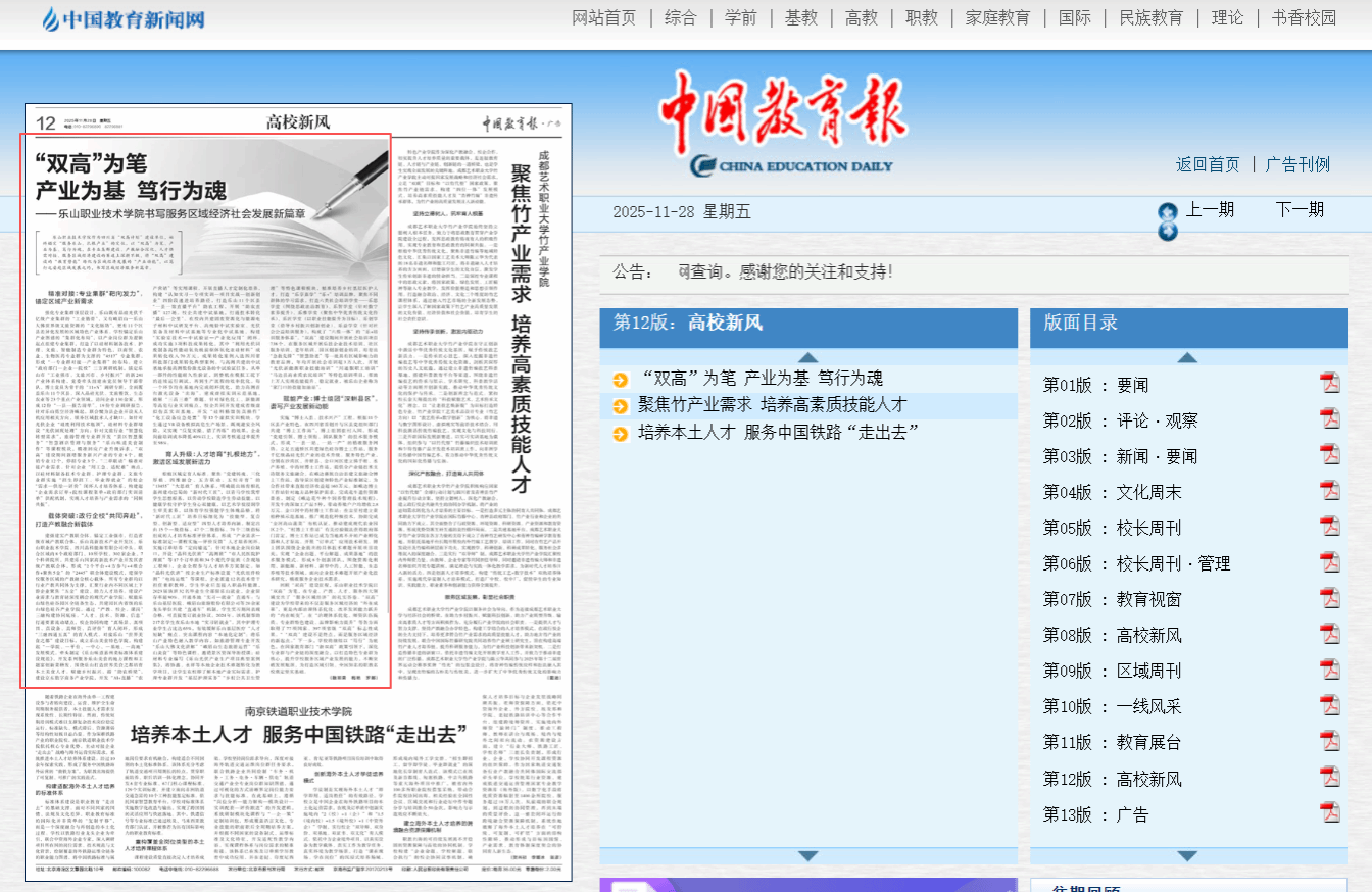时代浪潮奔涌,职教使命在肩。作为扎根嘉州大地的高等职业院校,beat365亚洲版官网始终锚定“双高计划”建设航向,以产业需求为导向,以实干笃行为底色,深耕职业教育沃土,厚植服务发展根基。从对接区域重点产业培育技术人才,到聚焦产业升级攻坚技术攻关,从深化产教融合构建协同生态,到赋能民生改善传递职教温度,beat365始终把自身发展融入乐山经济社会发展大局,以匠心育人才,以实干促发展,在服务产业振兴、推动区域进步的征程中笃定前行,书写着新时代职业教育服务地方发展的崭新篇章。11月28日,《中国教育报》以”‘双高’为笔 产业为基 笃行为魂--beat365亚洲版官网书写服务区域经济社会发展新篇章”为题,对beat365“双高”工作特色和成效进行了详细报道。