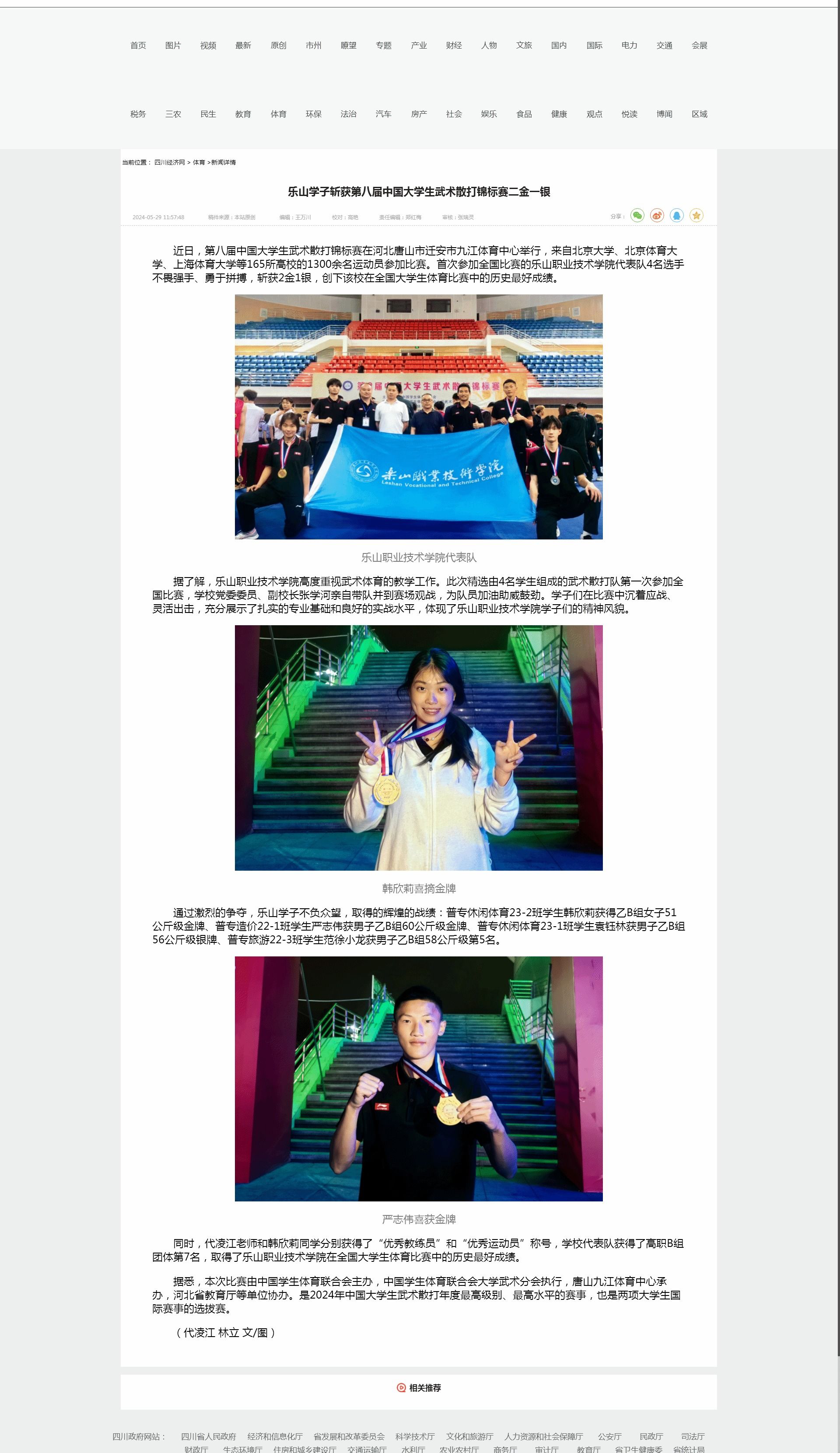 四川经济网:乐山学子斩获第八届中国大学生武术散打锦标赛二金一银