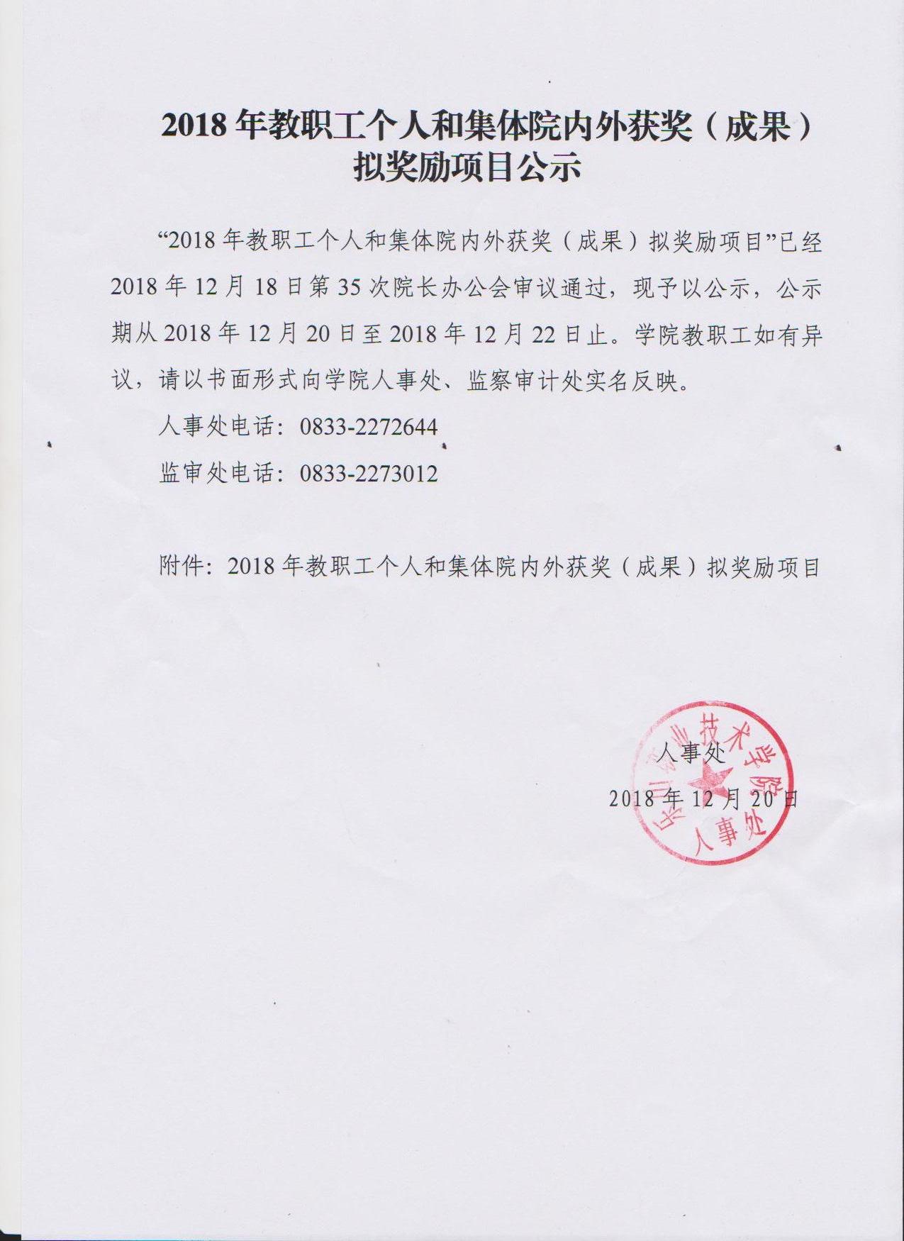 2018年教职工个人和集体院内外获奖(成果)拟奖励项目公示