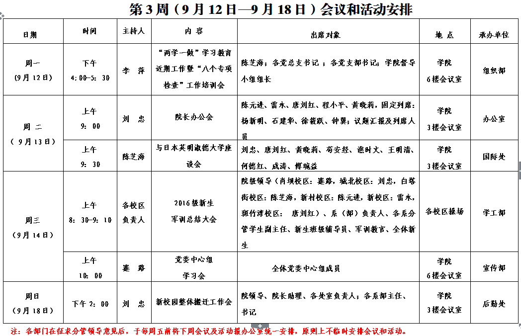 第3周(9月12日—9月18日)会议和活动安排