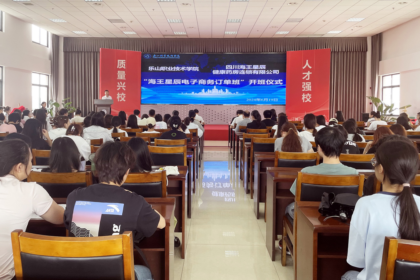 6月19日下午,beat365亚洲版官网与四川海王星辰健康药房连锁有限公司定向合作的“海王星辰电子商务班”开班仪式在学术交流中心举行,学校党委副书记张佳,生物医药学院相关负责人,海王星辰四川分部副总经理兼德阳事业部总经理王芳、四川分部人力资源部经理雷正芹、四川分部人力资源部招聘主管袁文莉、四川分部琉璃路店经理林静出席。生物医药学院副院长(主持工作)李喜安主持开班仪式。