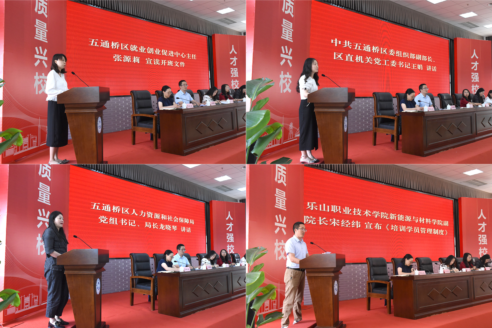 五通桥区就业创业促进中心主任张源莉宣读开班文件,中共五通桥区委组织部副部长、区直机关党工委书记王娟讲话,介绍五通桥区人才引进政策和计划,鼓励参训学员,就业到五通、安家到五通,共享新机遇、共谋新发展。五通桥区人力资源和社会保障局党组书记、局长龙晓琴对学校的重视和安排表示感谢,对培训工作提出了要求,并祝全体学员学有所获,为未来就业做好准备。