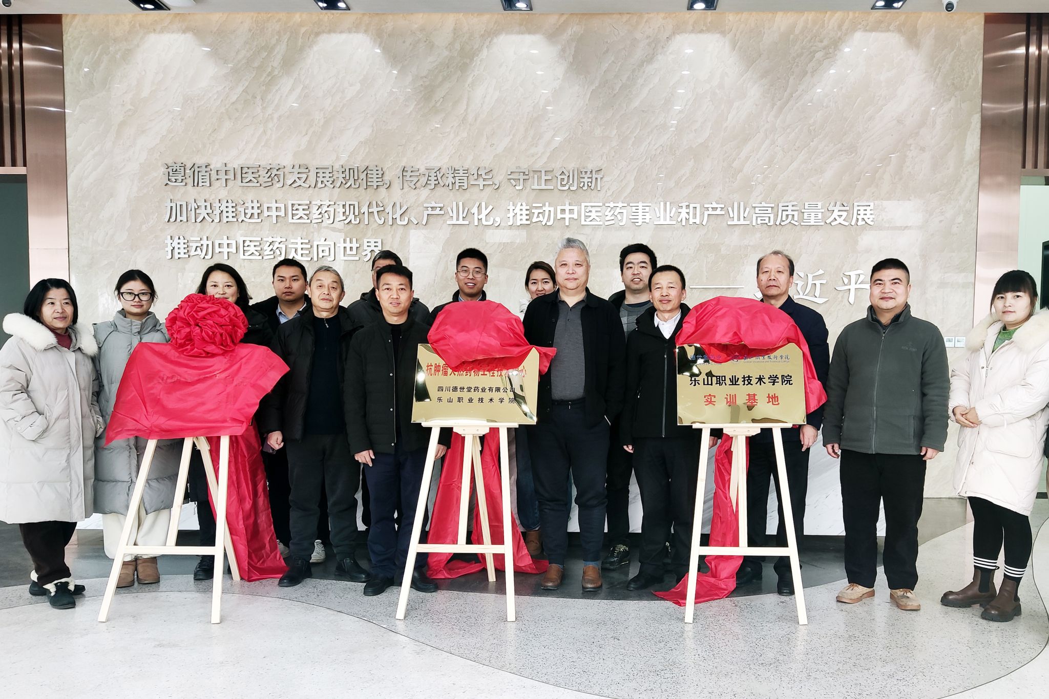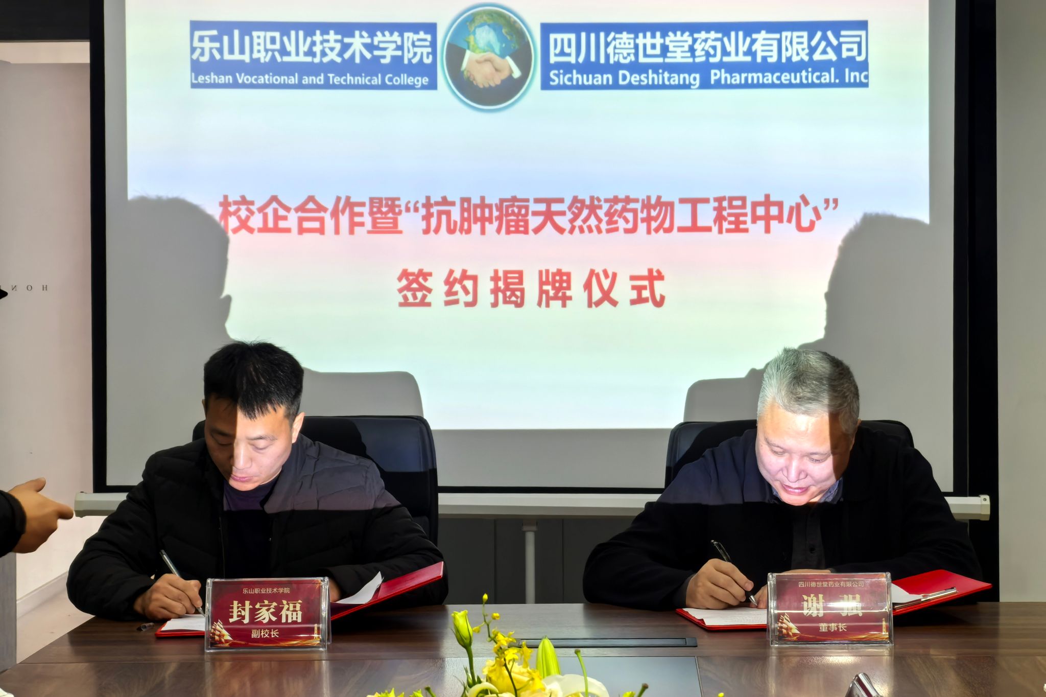 1月15日上午,beat365亚洲版官网和四川德世堂药业有限公司共同签署《校企合作协议书》,并在公司举行了校企共建“抗肿瘤天然药物工程技术中心”“实习基地”“双师基地”揭牌仪式。beat365亚洲版官网党委委员、副校长封家福博士,四川德世堂药业有限公司董事长谢强、总经理帅仕平出席签约仪式,beat365亚洲版官网生物医药学院副院长李喜安博士、教师代表和德世堂药业技术部全体成员共同见证。