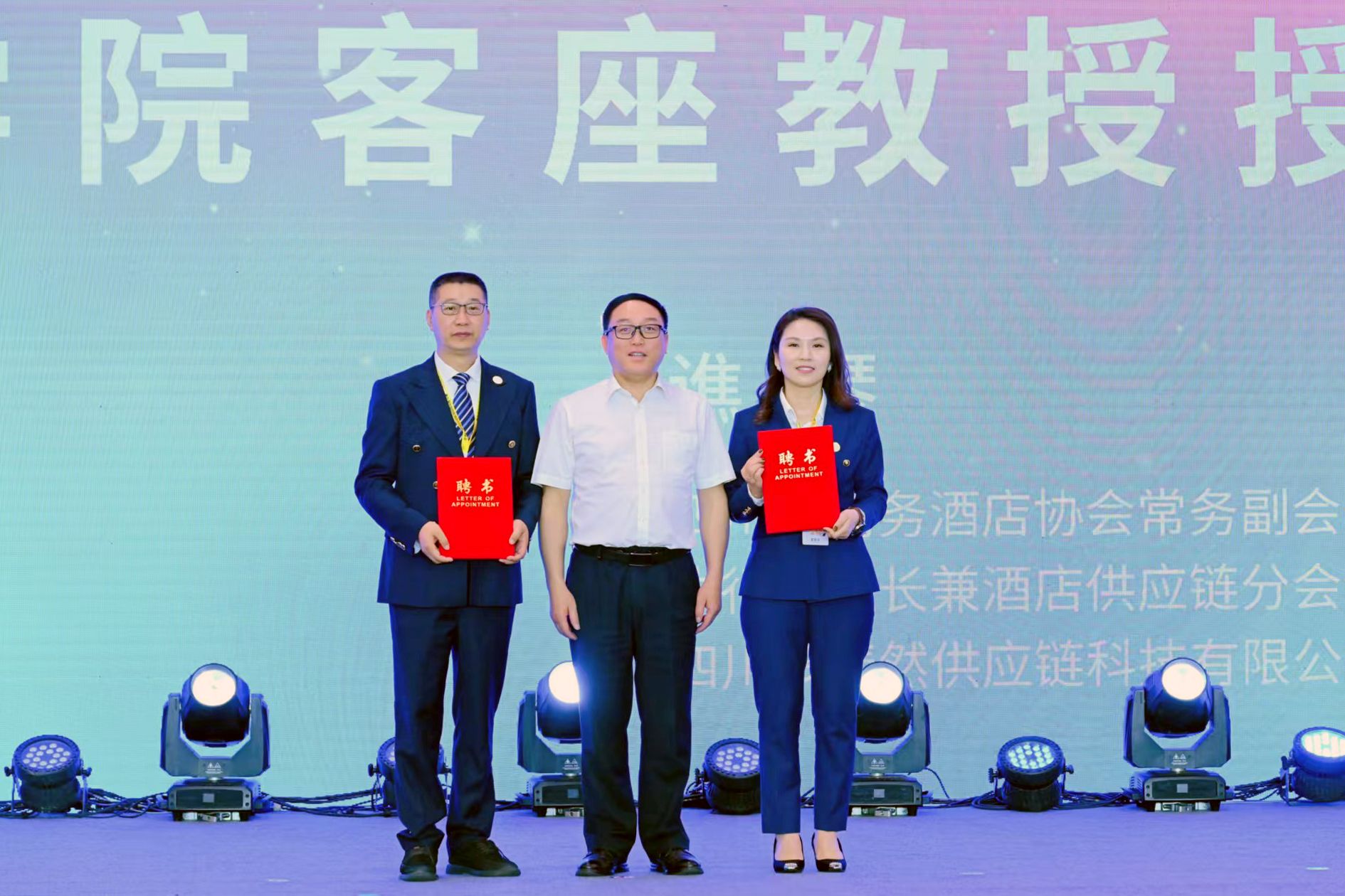 会上,成定彬作为主要嘉宾参加了开幕启动仪式,并为两位客座教授——四川省商务酒店协会副会长、成都由里智慧酒店管理有限公司董事长李智,四川省商务酒店协会常务副会长、执行秘书长兼酒店供应链分会会长谯琴颁发聘书。