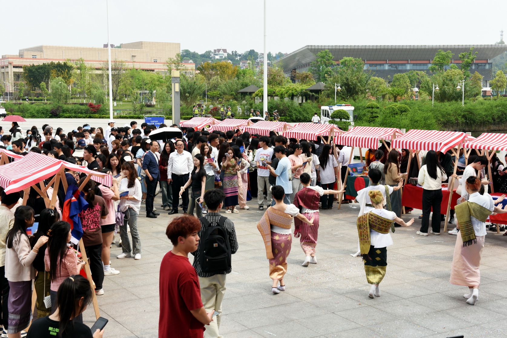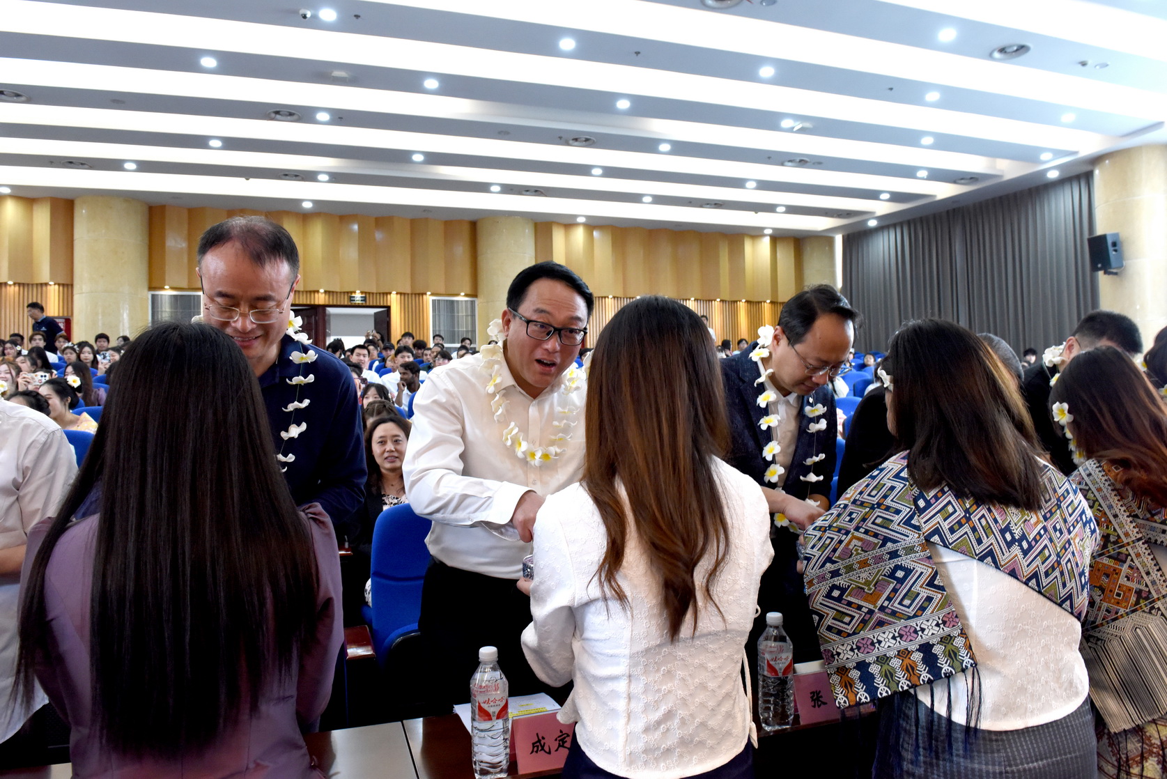 来自老挝、泰国、柬埔寨的留学生代表为学校领导献花,与校领导互相滴撒福水,表达感谢与祝福。