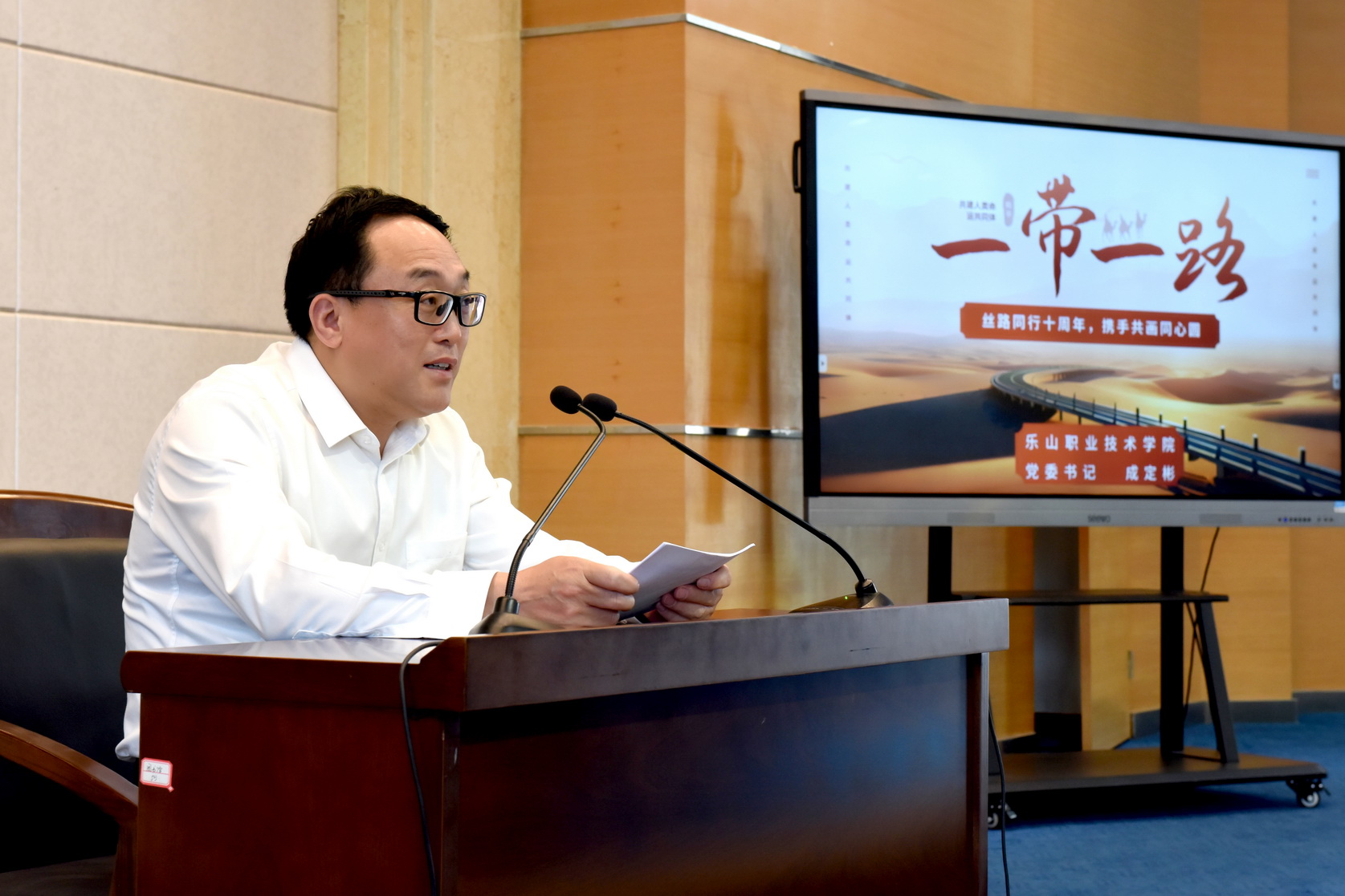 学校党委书记成定彬在开幕式上作“丝路同行十周年,携手共画同心圆”专题讲座,讲座回顾了“一带一路”倡议提出的历史背景以及倡议实施十周年来取得的巨大成就,总结了学校开展国际合作与交流取得的成果,希望同学们努力学习,为构建人类命运共同体贡献青春力量。