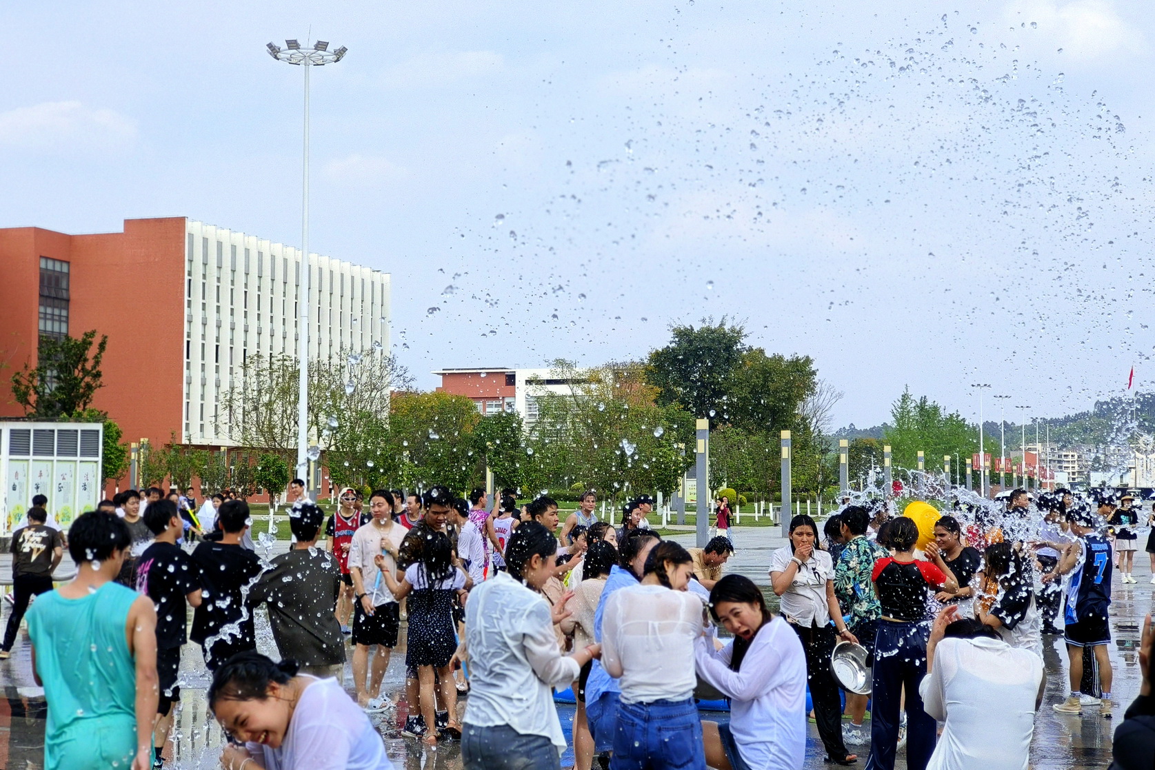 开幕式后,师生应邀前往图书馆外参加中外文化节“乐享丝路”游园会,品尝各国传统美食,观看各国节目表演,体验传统中医文化和非遗扎染技艺。最后的“春色满园、水舞乐职”泼水活动把文化节活动推上了高潮,大家兴致高涨,相互洒水祝福。