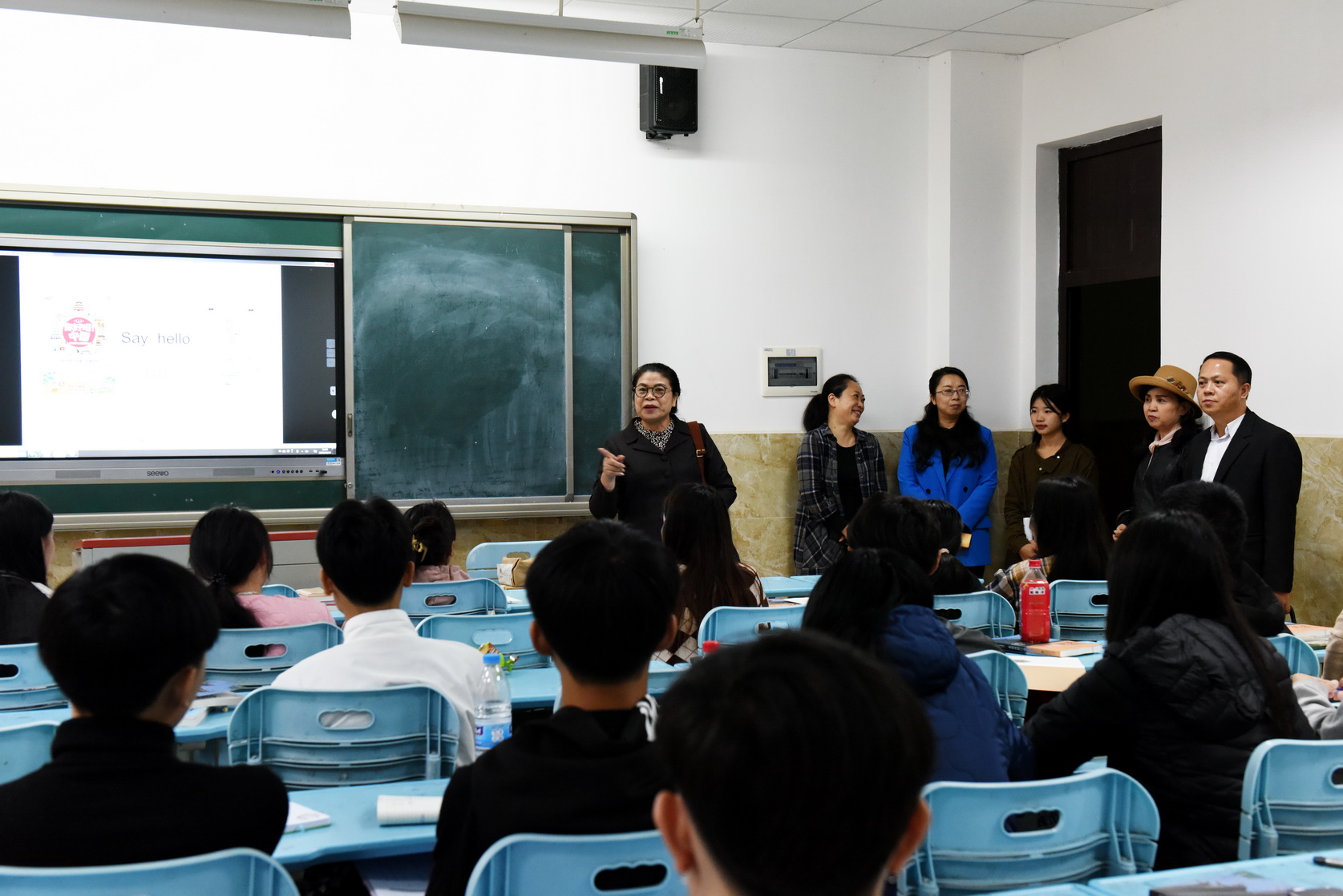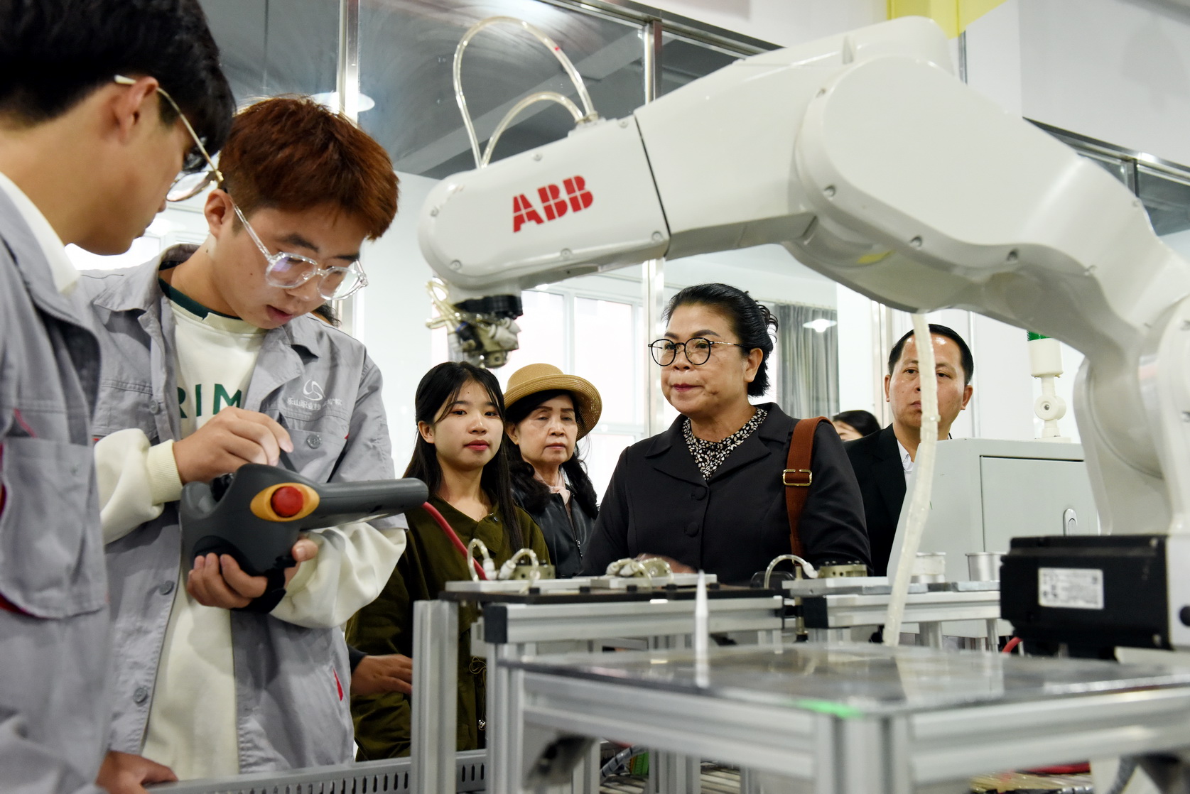 会前,周芹陪同老挝琅勃拉邦省教育与体育厅代表团一行参观考察了学生公寓、学生食堂、实训室、实习工厂等,还来到教室看望老挝琅勃拉邦省来校留学的2023级新生并与他们交流。