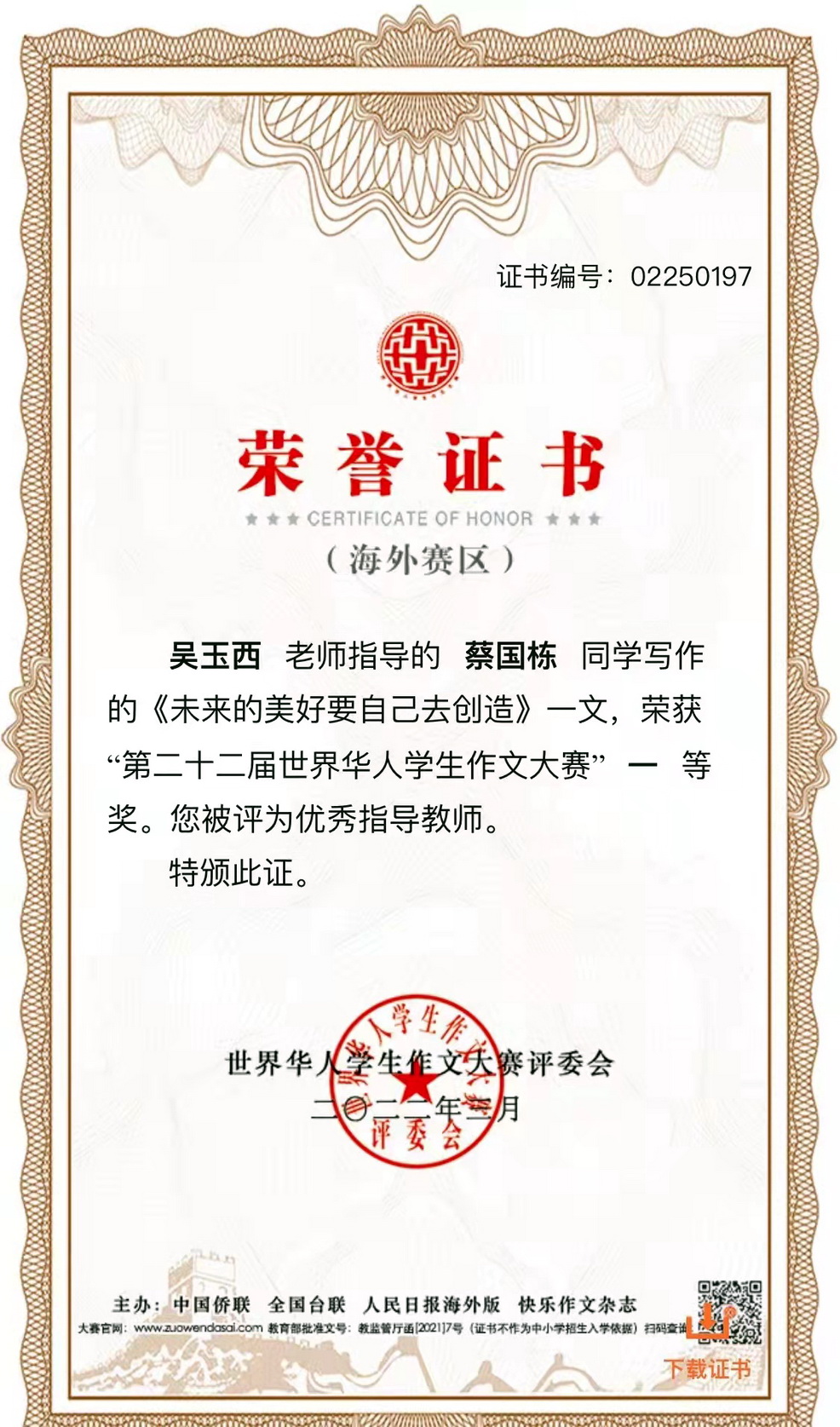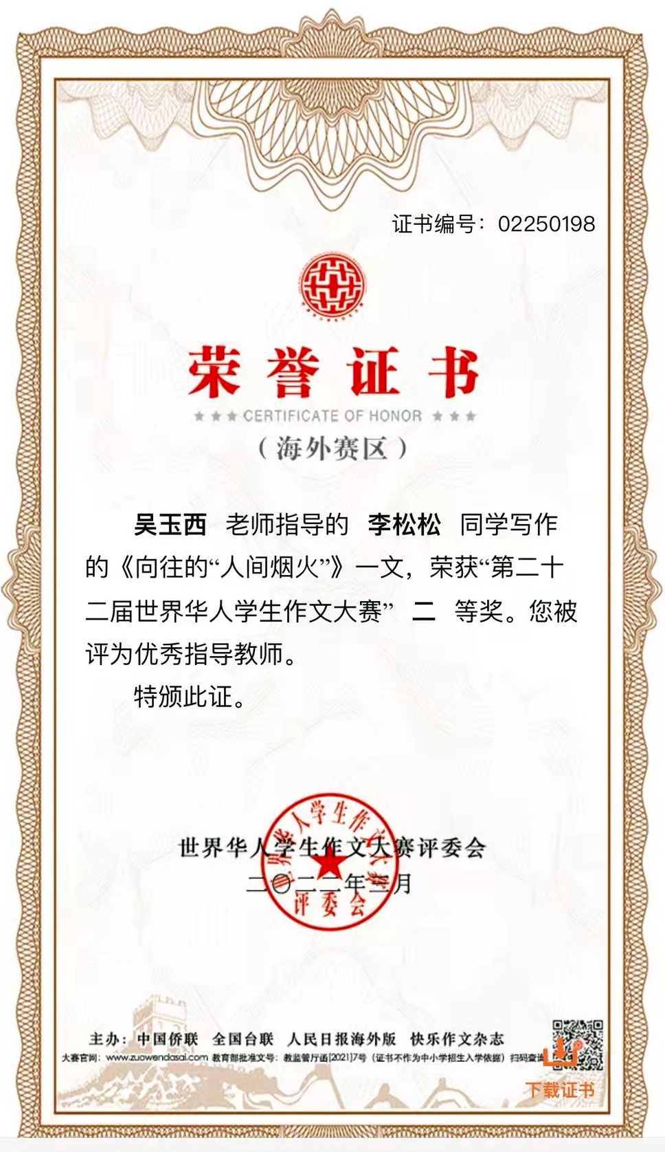 近日,学院基础公共课程部对外汉语老师吴玉西,指导的海外学生参加“第二十二届世界华人学生作文大赛”,喜获一等奖1个,二等奖2个,吴玉西被授予“优秀指导教师”荣誉证书。