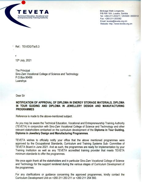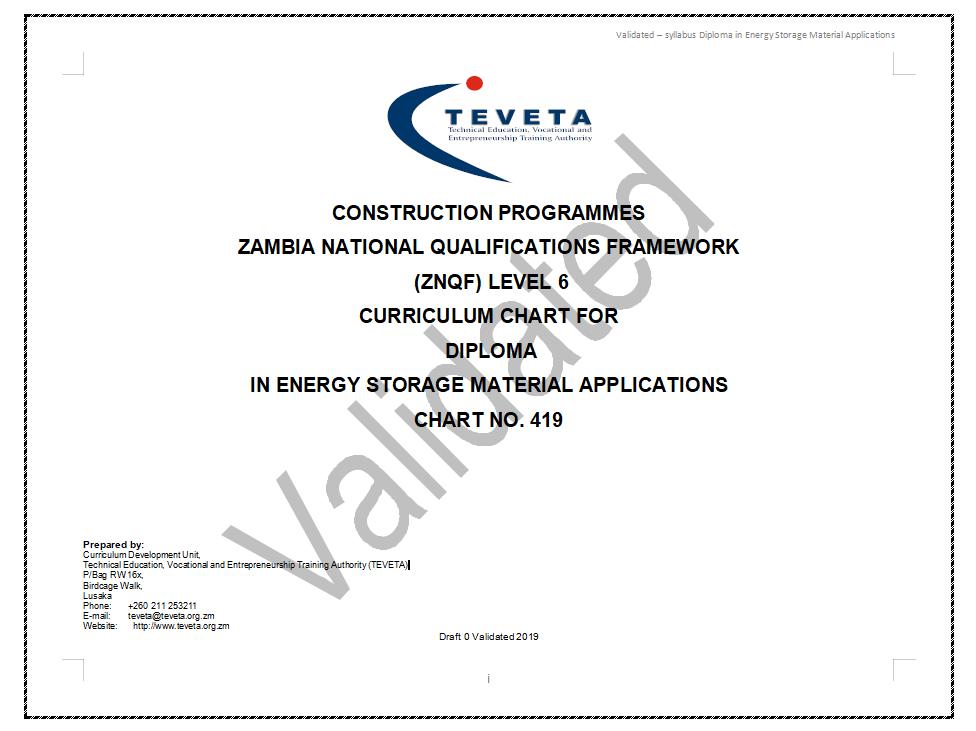 近日,从中国—赞比亚职业技术学院获悉,赞比亚职业教育与培训管理局正式批准中国—赞比亚职业技术学院申报的储能材料应用技术等3项专业教学标准,成为赞比亚国家职业教育教学标准。其中,储能材料应用技术专业教学标准是在有色金属工业人才中心的指导下,由学院新能源工程系王丽、梅艳、贾曦、邓盼盼、杨顺等老师联合企业工程技术人员共同组成标准开发团队,完成了专业教学标准的起草、答辩和终审工作。