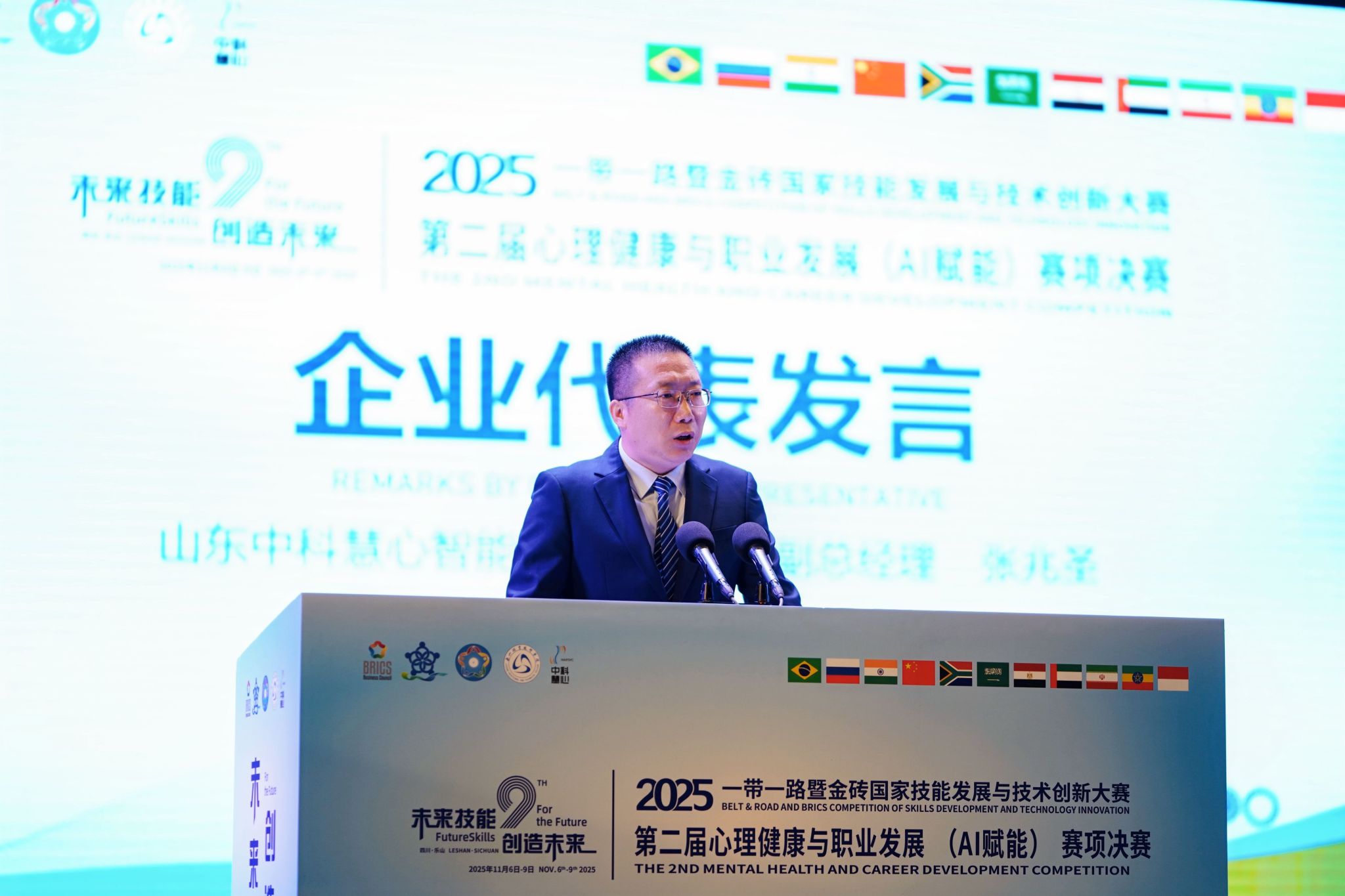 张兆圣代表承办企业致辞。山东中科慧心智能科技有限公司为本届大赛提供以“人脸微表情识别技术”和“人因感知终端”为核心的AI裁判系统,旨在通过客观、精准的AI评估,从细微表情与生理信号中解读选手心理状态与职业潜力。此次实践生动展现了AI赋能心理健康的创新价值,公司将持续推动前沿技术与心理健康领域的深度融合,助力个体在时代变革中实现全面发展。