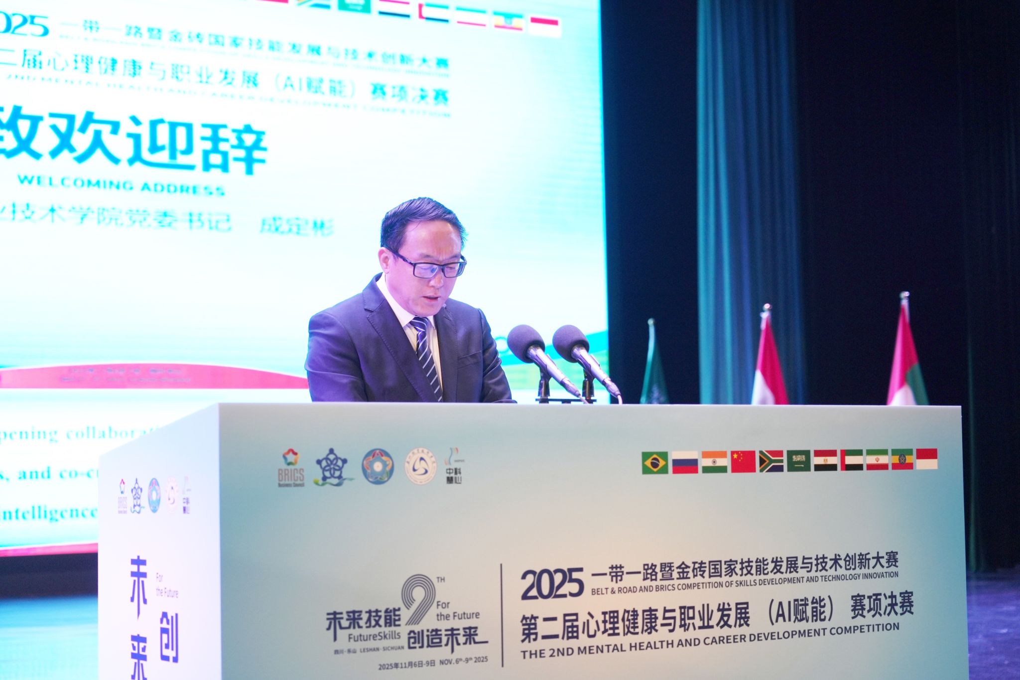 11月6日,2025一带一路暨金砖国家技能发展与技术创新大赛之第二届心理健康与职业发展(AI赋能)赛项决赛开幕式在beat365亚洲版官网举行。