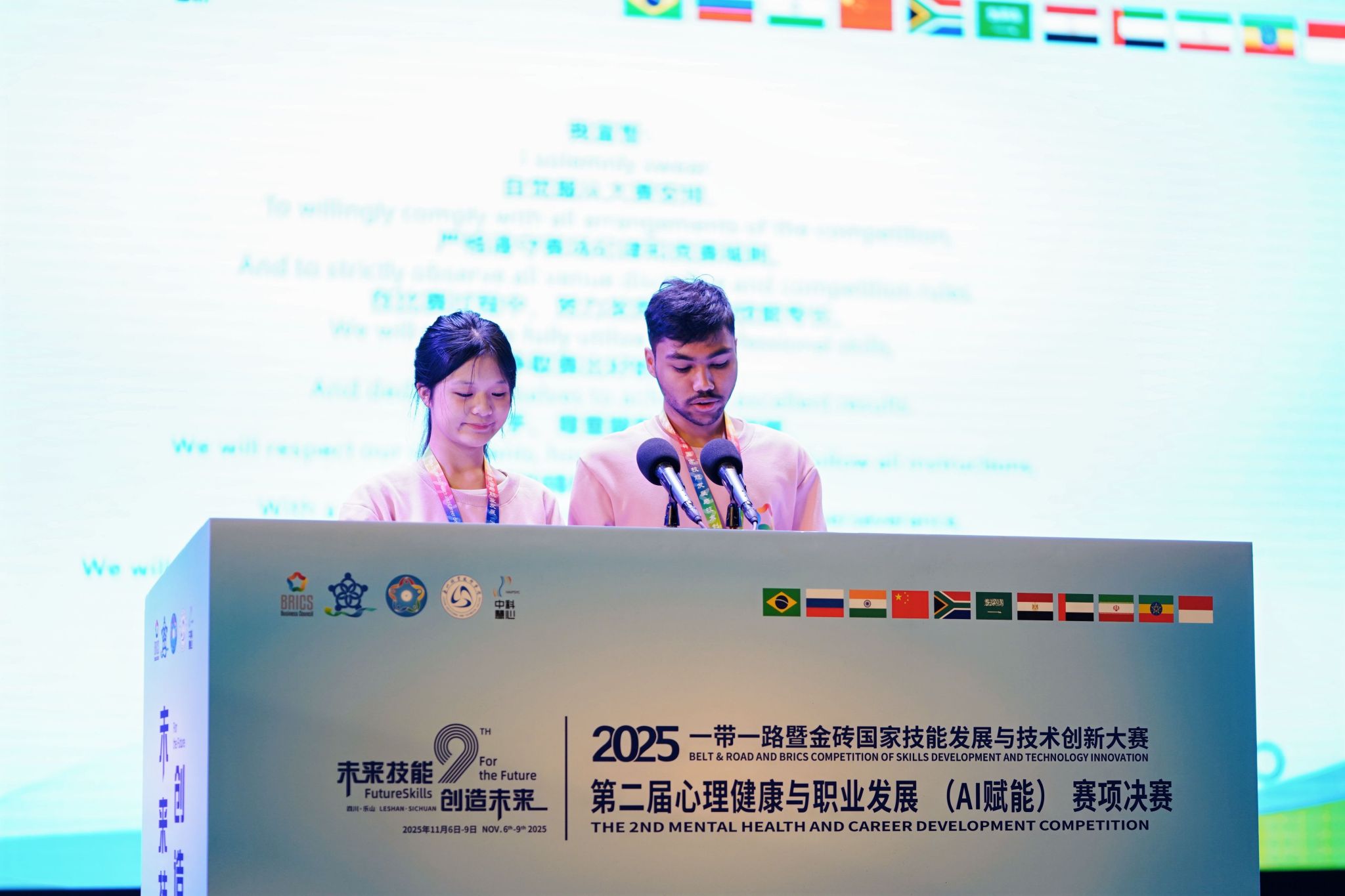 宣誓环节,裁判员逄霞带领全体裁判员宣誓:将恪守比赛规则,秉承公正、公平、公开原则开展执裁工作,弘扬裁判精神,为确保本次大赛圆满成功竭尽所能、贡献力量。中国参赛选手代表何萌与国际参赛选手代表法沙共同带领全体选手宣誓:将恪守赛规、公平竞技,展现“心理健康+AI”复合型人才的优秀素养。