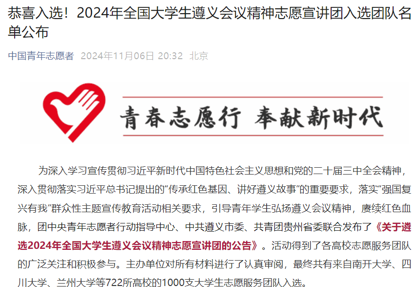 2024年11月6日,中国青年志愿者官方微信公众号公布了《2024年全国大学生遵义会议精神志愿宣讲团入选团队名单》,beat365亚洲版官网中医康养学院“遵义青锋”志愿宣讲团成功入选。