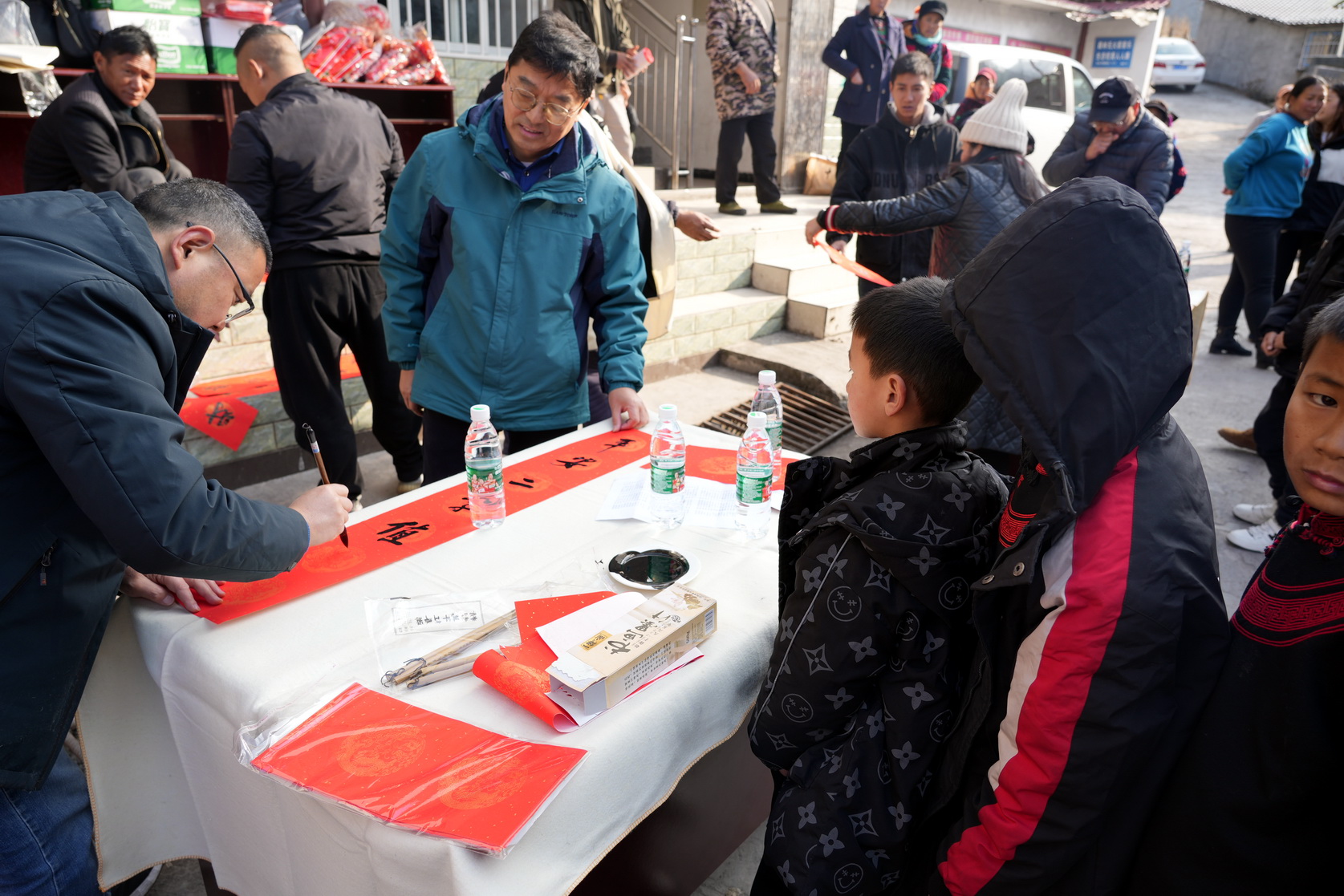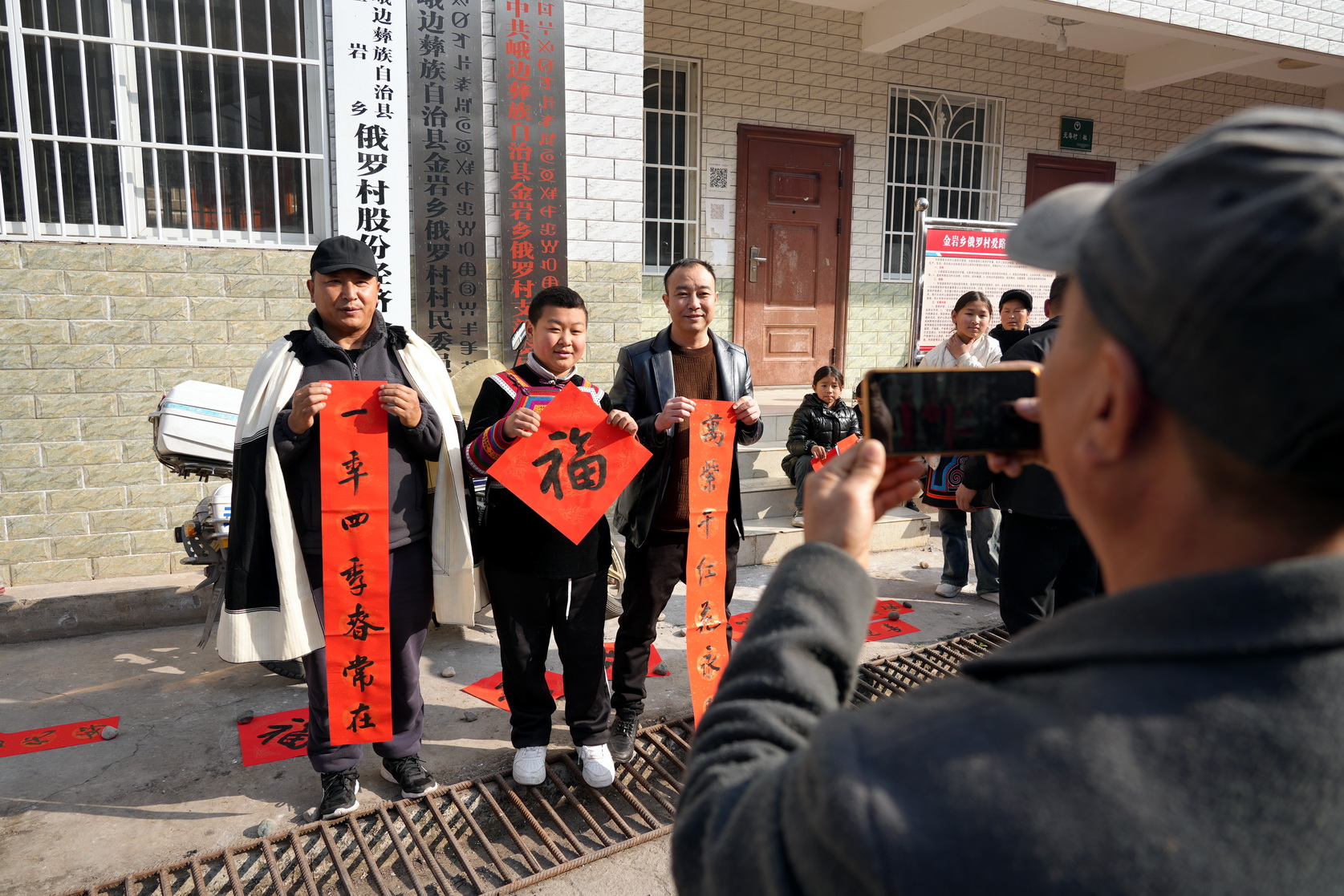 上午,俄罗村党群服务中心文化院坝上,大批身穿彝族传统服饰的村民早已排起了长队等候。队伍抵达后,在学校派驻俄罗村的第一书记李宏伟和俄罗村党支部副书记冉拉格根的组织下,村民们迅即用桌子搭建好书写台,五名书法家摆好文房四宝,挥毫泼墨,兴致勃勃地现场为村民写下一副副春联、一张张“福”字。