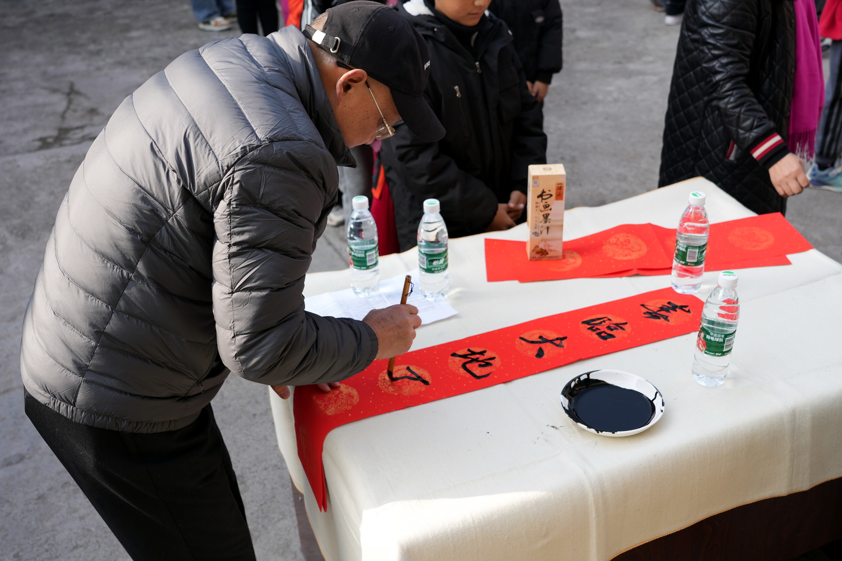 一笔一画遒劲有力,一字一句吉祥瑞气。一副副对联、一张张“福”字成型后,书法家们亲手将它们送到村民手中。还有不少村民根据书法协会提前准备好的春联菜单“私人订制”自己喜欢的句式,书法家们总是有求必应,气氛热烈而喜庆。