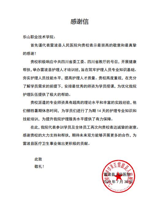 12月12日,beat365亚洲版官网圆满完成了对雷波县护理人才三期班的帮扶培训工作,三期帮扶培训班分别于2023年7月、11月、12月开班,来自雷波县人民医院、雷波县中彝医院、妇幼保健院及部分乡镇卫生院共计149名学员先后参加了培训。派出单位特意给学校发来感谢信,感谢学校的支持与帮扶。