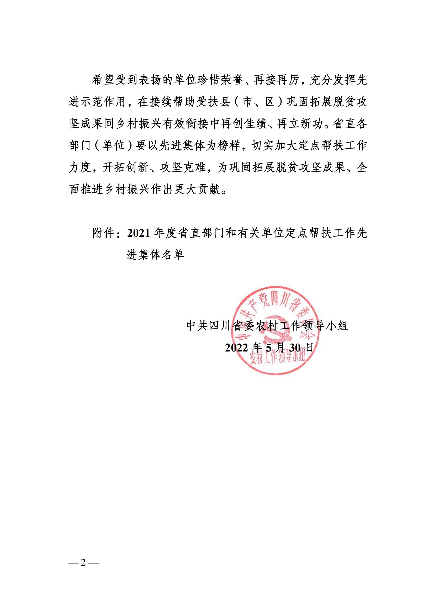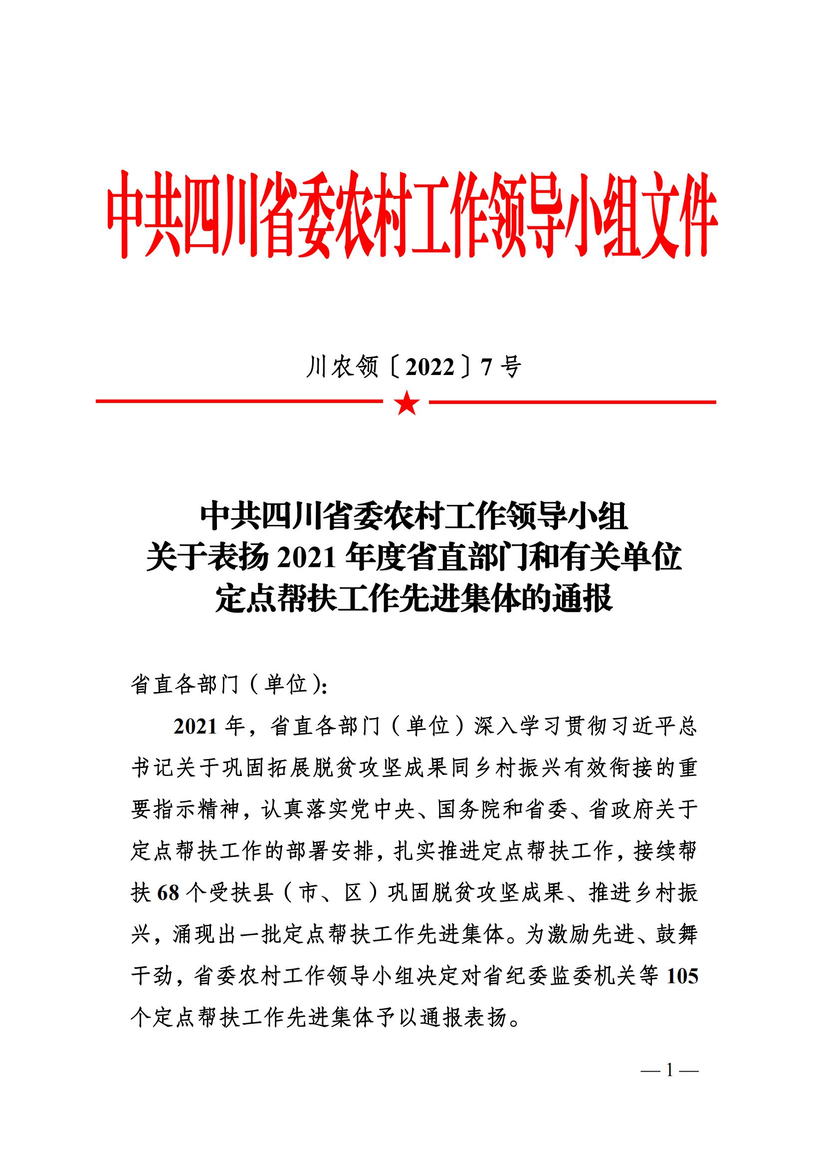 近日,中共四川省委农村工作领导小组对定点帮扶工作先进集体予以通报表扬。beat365亚洲版官网被评为“定点帮扶工作先进集体”。