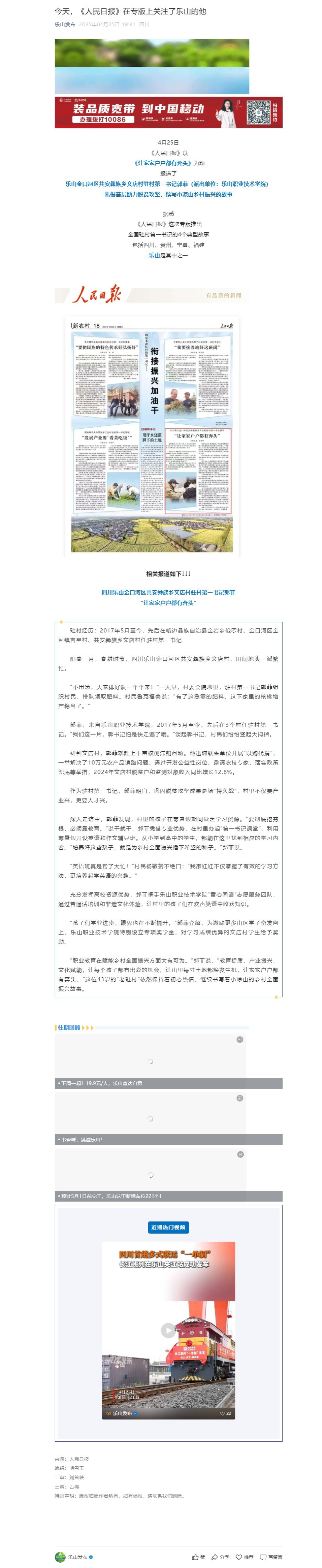 乐山发布:今天,《人民日报》在专版上关注了乐山的他