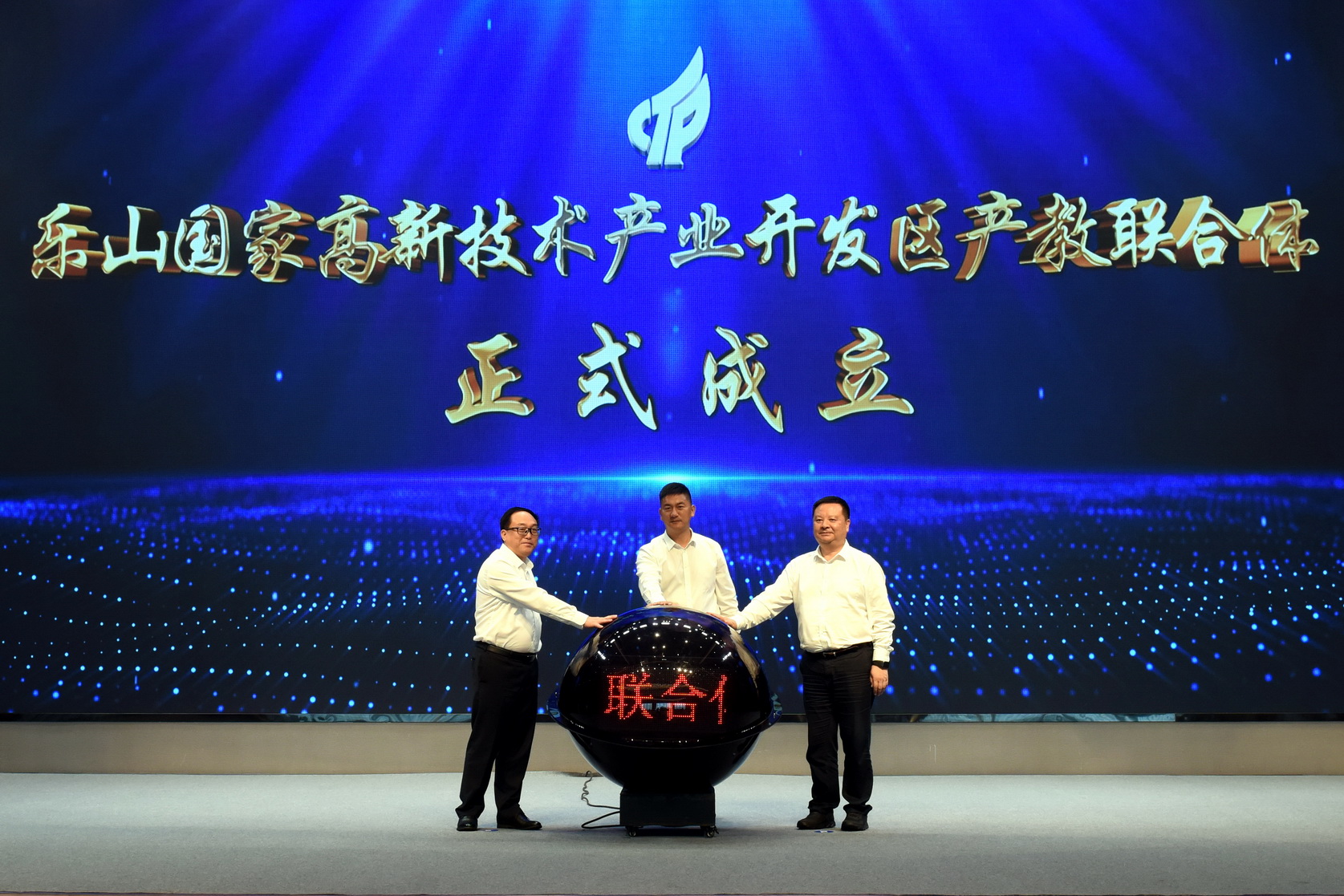 乐山市人民政府副市长沙万强、beat365亚洲版官网党委书记成定彬、乐山高新区党工委书记广兵为“产教联合体成立”揭牌。