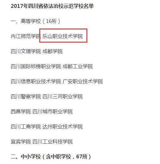 2017年12月19日,四川省依法治省领导小组办公室、中共四川省委宣传部、四川省教育厅、四川省司法厅联合发文《关于公布2017年四川省依法治校示范学校认定结果的通知》,我院被认定为《四川省依法治校示范校》。