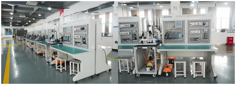 拥有先进制造中心、智能制造协同创新中心、机器人与智能控制创新实践中心、智能汽车工作室、西门子MCD机电概念一体化设计实训室和乐山市特种机器人工程技术研究中心等“产学研用创”“五位一体”的创新实践平台。机器人与智能控制创新实践中心主要设备包括智能微型产线与数据管理平台、机器人系统集成、智能控制装调、智能控制系统创新与设计、智能机器人应用、CSPACE实时仿真控制系统等设备46套,设备仪器值近1000万元。其中,微型产线与机器人系统集成以智慧仓储、视觉检测、无序抓取上下料、装配等流程为主线搭建出一条可追溯产品检验、分拣、装配、转运、入库流程的自动生产线,构建了一个全面感知、无缝联接、高度智能的数字化自动化产线,配套VR与数字孪生和线上智能制造实训系统,个性化定制智能协同制造数字化实训系统用于支持工业机器人技术专业群建设和技术技能人才的培养。