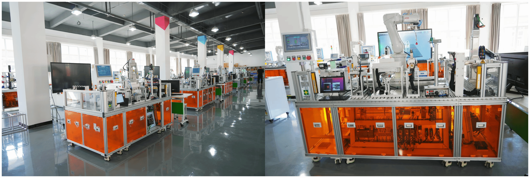 机器人与智能控制创新实践中心主要设备包括智能微型产线与数据管理平台、机器人系统集成、智能控制装调、智能控制系统创新与设计、智能机器人应用、CSPACE实时仿真控制系统等设备46套,设备仪器值近1000万元。其中,微型产线与机器人系统集成以智慧仓储、视觉检测、无序抓取上下料、装配等流程为主线搭建出一条可追溯产品检验、分拣、装配、转运、入库流程的自动生产线,构建了一个全面感知、无缝联接、高度智能的数字化自动化产线,配套VR与数字孪生和线上智能制造实训系统,个性化定制智能协同制造数字化实训系统用于支持工业机器人技术专业群建设和技术技能人才的培养。