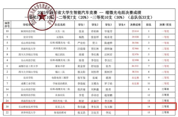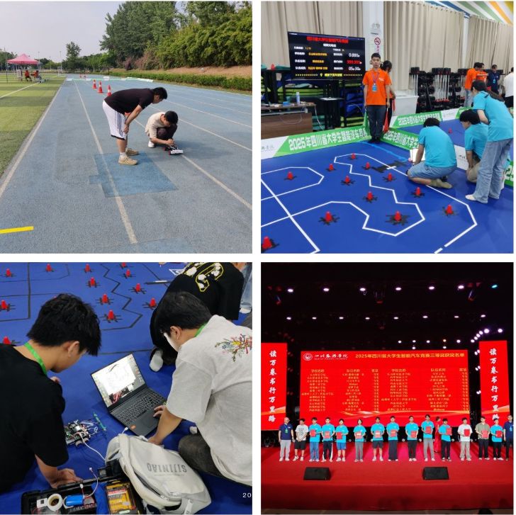 6月6-8日,由四川省教育厅主办的2025年四川省大学生智能汽车竞赛在四川旅游学院举行,beat365智能制造学院陈景琪、刘磊、谈振等教师指导6支队伍参赛,经过激烈角逐,最终获得省级三等奖4项,分别是缩微电磁组2项、缩微光电组1项、极速越野组1项。
