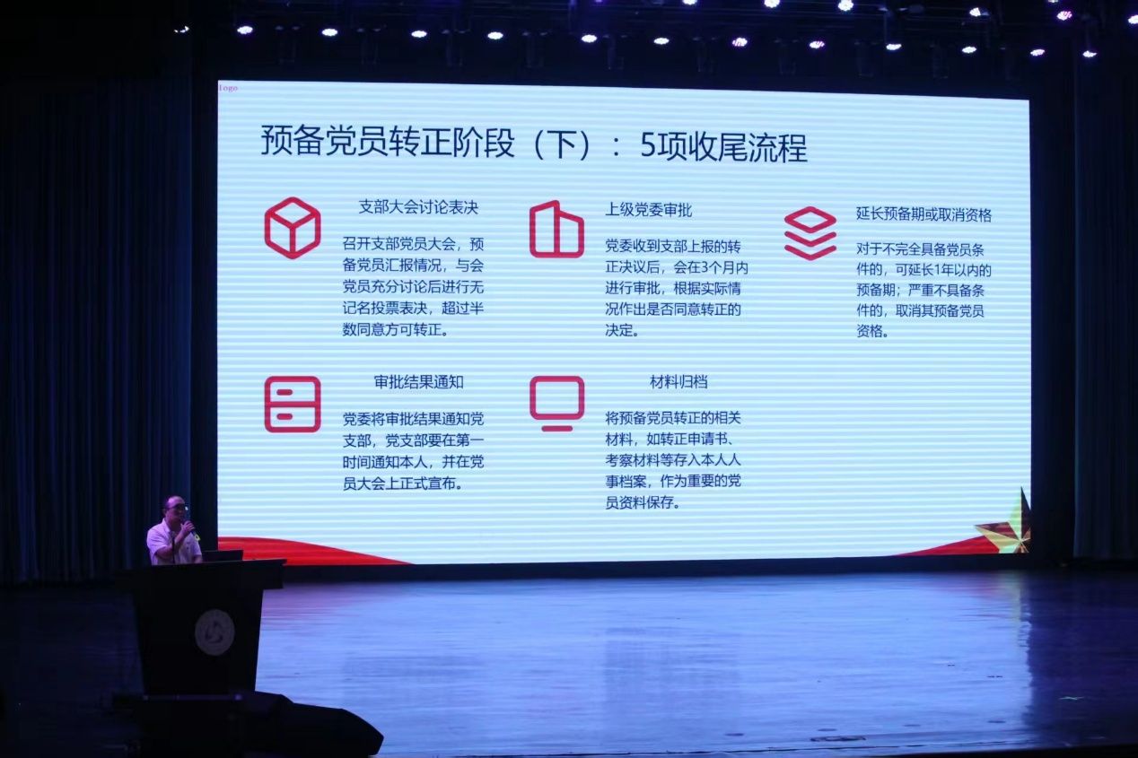 在思想政治及入党知识专题宣讲环节,赵鑫老师深入浅出地阐述了当代大学生积极向党组织靠拢的重要意义,并详细解读了入党条件与规范流程,为新生筑牢信仰之基。