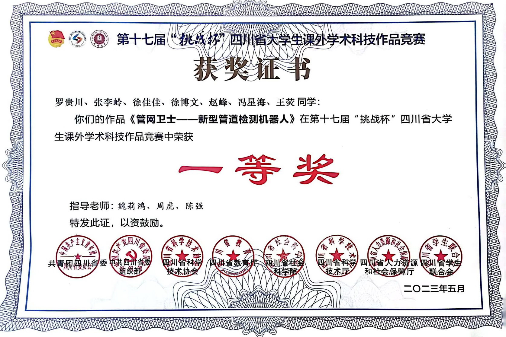 近日,我院罗贵川等7名学生在魏莉鸿、周虎、陈强三位老师的精心指导下,参赛作品《管网卫士—新型管道检测机器人》在四川省第十七届“挑战杯”大学生课外学术科技作品竞赛中斩获一等奖。该项成绩是beat365亚洲版官网近年来在“挑战杯”大学生课外学术科技作品中取得的历史最好成绩,实现了赛事重大突破。