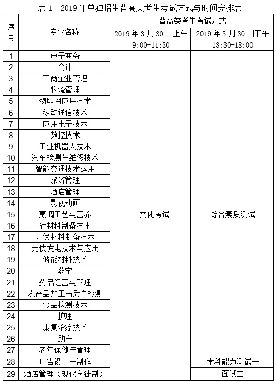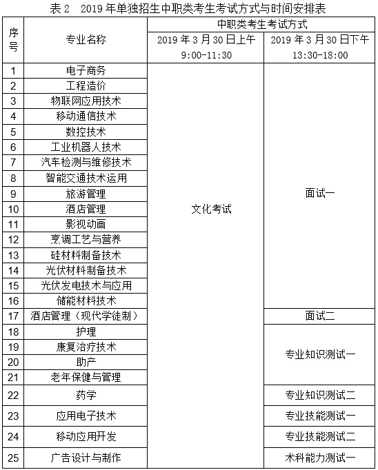 本次单独招生考试采用“文化考试+测试”方式进行,总成绩满分为500分,其中“文化考试”为300分,“测试”(分面试、综合素质测试、专业知识测试、专业技能测试、术科能力测试五种形式)为200分。考生的文化考试成绩和测试成绩两项相加即为其总成绩。具体考试方式与时间安排见表1、表2和表3所示。