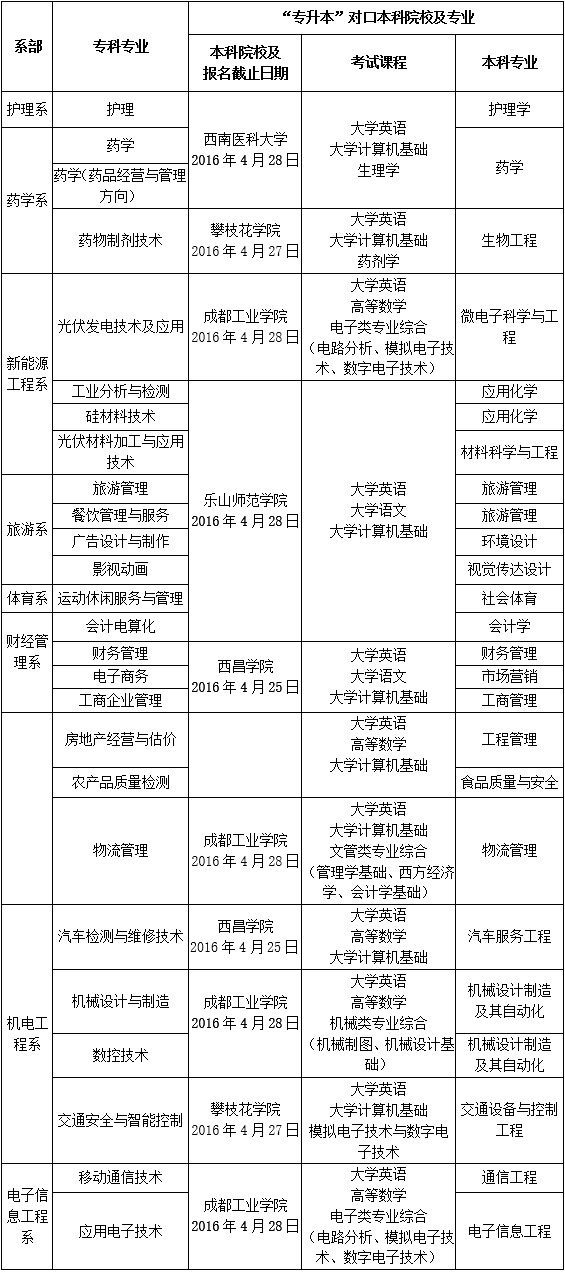 根据《四川省教育厅关于2016年普通高等学校选拔优秀专科毕业生进入本科阶段学习的通知》(川教函〔2016〕151号)文件通知的精神(见附件1),现将2016年学院应届三年制专科毕业生报考跨校“专升本”相关事宜通知如下: