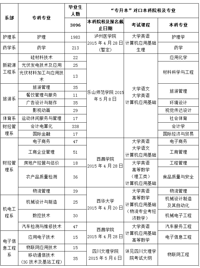根据《四川省教育厅关于2015年普通高等学校选拔优秀专科毕业生进入本科阶段学习的通知》(川教函〔2015〕155号)文件通知的精神(见附件1),现将2015年学院应届三年制专科毕业生报考跨校“专升本”相关事宜通知如下: