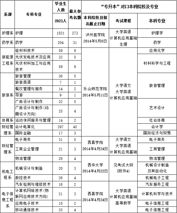根据《四川省教育厅关于2014年普通高等学校选拔优秀专科毕业生进入本科阶段学习的通知》(川教函〔2014〕164号)文件通知的精神(见附件1),现将2014年学院应届三年制专科毕业生报考跨校“专升本”相关事宜通知如下: