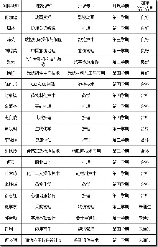 根据《beat365亚洲版官网以能力为本位的项目化课程改革实施方案》(乐职院【2012】65号)文件精神,学院于2013年1月28-29日由常州工程职业技术学院专家对第一批21位进行项目化课程改革的教师进行了职业教育教学能力现场测评、2013年2月学院三大专业评委组对测评教师提交的材料进行了评审。经2月28日学院项目办领导小组会审核,现将综合测评结果公示如下: