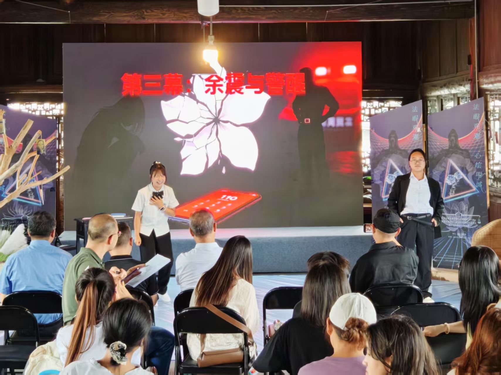 活动采用“五位一体”的沉浸式设计:1.武大西迁文保中心何燚副主任作武大西迁历史分享;2.心理专家指导参与者通过脸谱绘制进行自我认知探索;3.学生志愿者干雨欣、邓希贤生动演绎求职防性侵情景剧;4.市检察院检察官结合案例深度解读法律相关条款;5.全体参与者共创"法治共生树"并宣言。