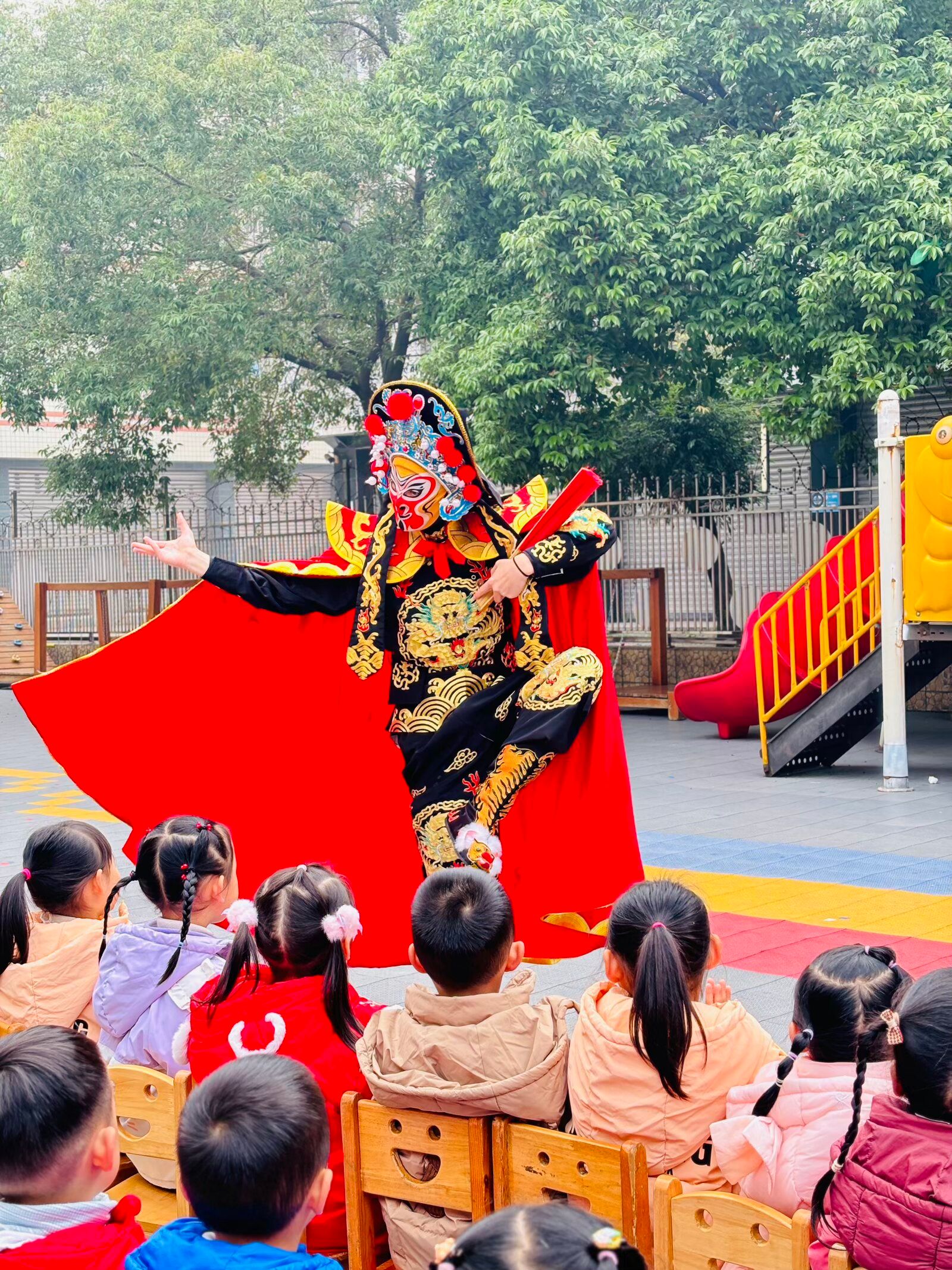 随后,精彩的非遗文化体验环节将气氛推向高潮。团队成员带来川剧变脸表演,身着绚丽的戏服,在红绸飘扬间展现脸谱的瞬息万变。孩子们目不转睛,不时发出阵阵惊叹与热烈掌声,在直观感受中加深了对传统艺术的认知与喜爱。