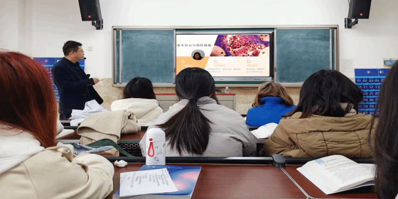 各班辅导员为同学们详细讲解了春季常见传染性疾病如流感、水痘、诺如病毒、结核病等的传播途径、临床症状及预防措施。辅导员结合医学专业特点,从日常防护细节入手,强调养成“勤洗手、戴口罩、常通风”的卫生习惯,倡导保持规律作息和适度运动,特别提醒出现发热、皮疹等症状应及时报备就医。