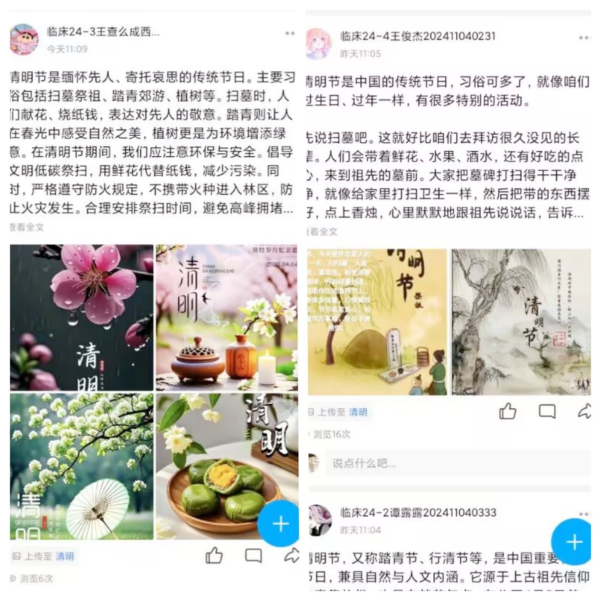 此次活动以清明节传统节日为主题、以线上参加活动的方式进行。在活动中,同学们收集了关于“清明节”的图片,并发表对清明习俗的感想。此次活动,以新颖的方式加深了同学们对中华优秀传统文化的了解,也树立了文明新风尚。
